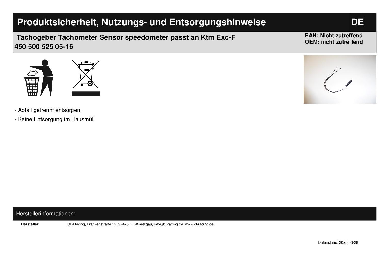 In dieser Auktion gibt es folgenden Artikel zu kaufen: Tachogeber für Digitaltacho (siehe Foto) Modell: passend für Ktm EXC 125 - 530 (2- und 4-Takt) Bj.: 2005 - 2016 technische Daten: - Gewinde M8 - Kabelenden müssen an den Enden verlötet werden - Kabellänge ca. 20 cm Lieferumfang: 1 Stück Artikelzustand: neu Es handelt sich hierbei um kein Originalteil Bei Unklarheiten oder Fragen bitte erst E-Mail schreiben.