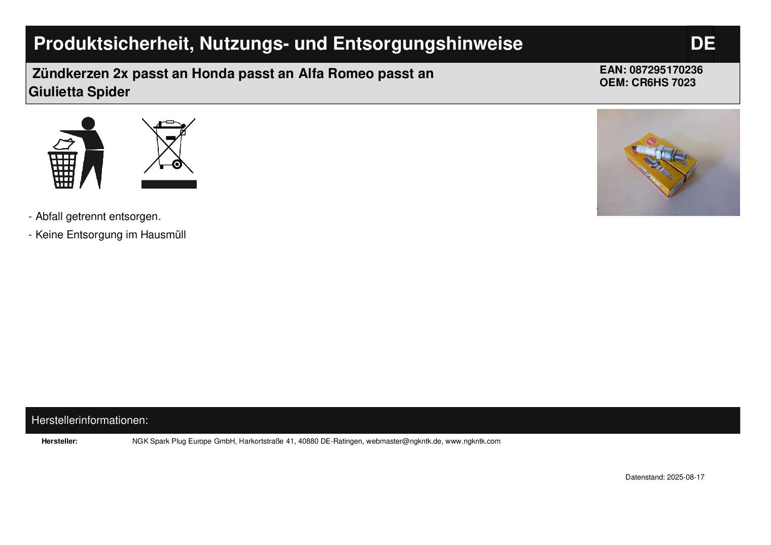 In dieser Auktion gibt es folgenden Artikel zu kaufen: Zündkerzen (siehe Foto) Typ: 7023 CR6HS Bitte vor dem Kauf Typ vergleichen! Lieferumfang: 2 Stück Artikelzustand: neu Bei Unklarheiten oder Fragen bitte erst E-Mail schreiben.