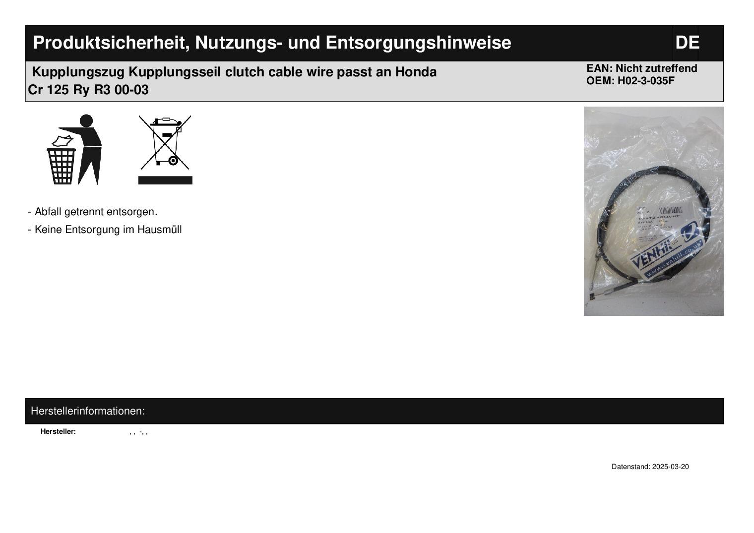 In dieser Auktion gibt es folgenden Artikel zu kaufen: Kupplungszug (siehe Foto) Modell: passend für Honda CR 125 RY-R3 Bj.: 2000 - 2003 Details: Edelstahlzug, Teflon-beschichtet, mit Teflon-Innenhülle Vergleichsnummer: H02-3-035F Bitte Teilenummer vergleichen! Lieferumfang: siehe Foto Artikelzustand: neu aus Geschäftsauflösung, mit minimalen Lagerspuren; Zustand siehe Foto Bei Unklarheiten oder Fragen bitte erst E-Mail schreiben.