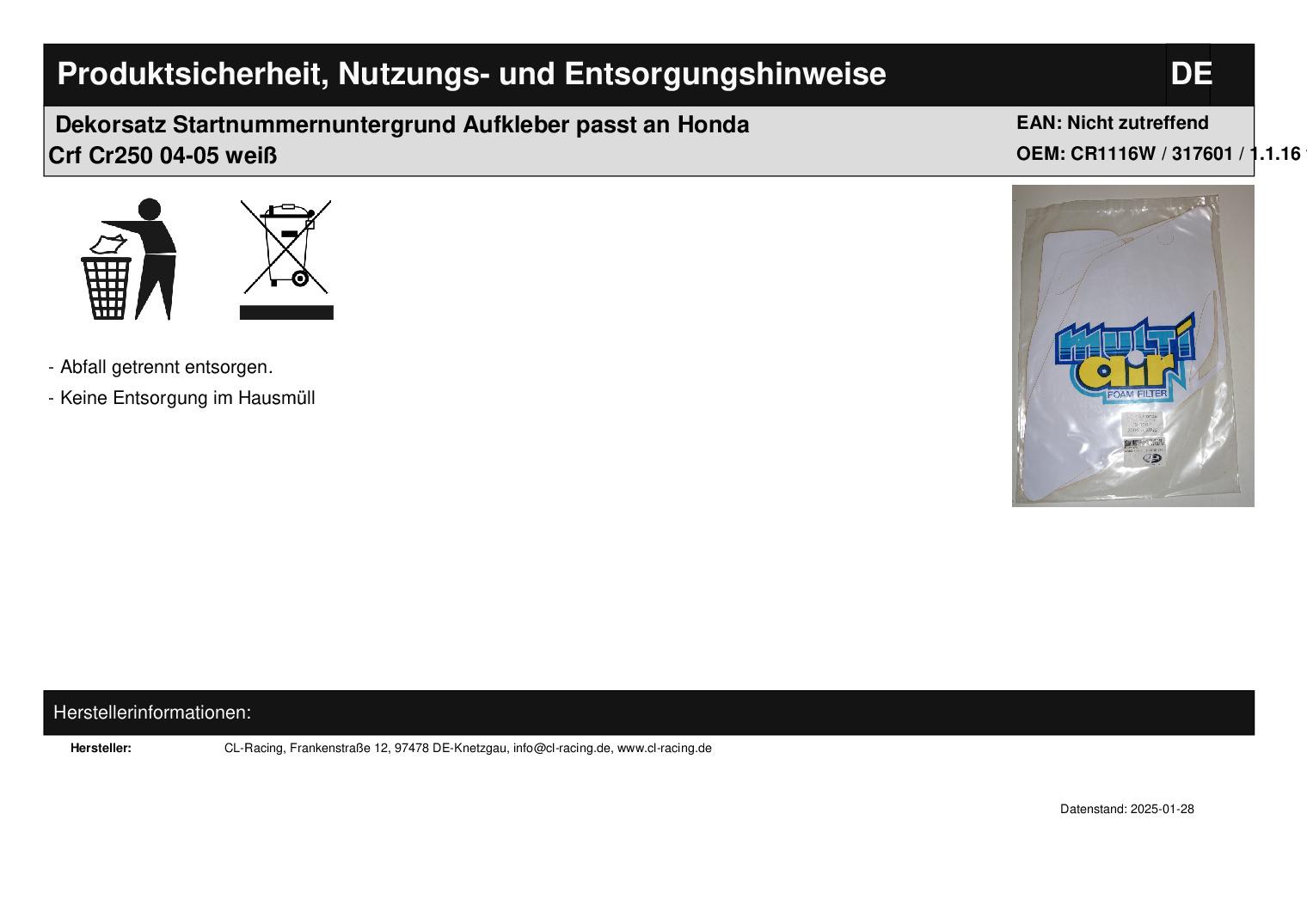 In dieser Auktion gibt es folgenden Artikel zu kaufen: Dekorsatz (siehe Foto) Modell: passend für Honda CR 250F Bj.: 04 - 05 Lieferumfang: siehe Foto Es werden nur die Aufkleber geliefert, die auf dem Foto zu sehen sind. Artikelzustand: neu aus Geschäftsauflösung; Sticker liegen schon länger; daher werden diese als defekt verkauft; Zustand siehe Foto