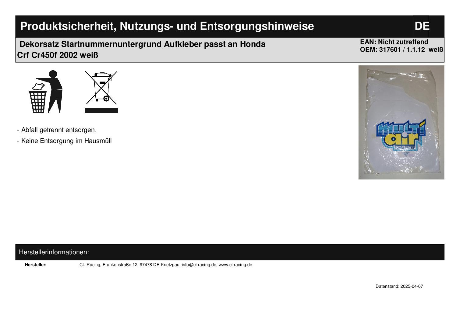 Titel: Dekorsatz Startnummernuntergrund Aufkleber passt an Honda Crf Cr450f 2002 weiß