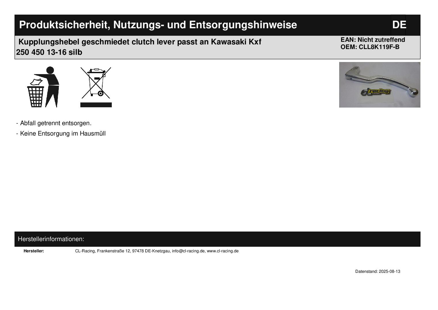 In dieser Auktion gibt es folgenden Artikel zu kaufen: geschmiedeter Kupplungshebel (siehe Foto) Modell: passend für Kawasaki KXF 250 Bj.: 13 - 16 (4-Takt) KXF 450 Bj.: 13 - 18 (4-Takt) Artikelbeschreibung: Durch das Schmieden wird die Materialdichte erhöht und macht den Hebel elastischer und damit bruchsicherer als Hebel, die durch das Spritzgussverfahren produziert werden. Lieferumfang: siehe Foto Artikelzustand: neu Bei Unklarheiten oder Fragen bitte erst E-Mail schreiben.