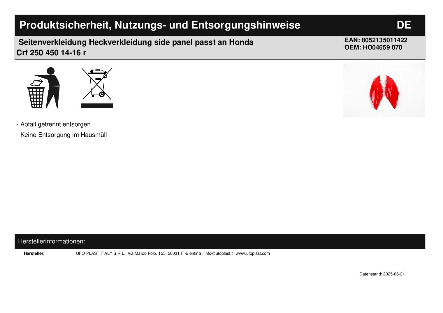 In dieser Auktion gibt es folgenden Artikel zu kaufen: 1 Seitenverkleidung -kein Paar- (siehe Foto) Fahrzeug: passend für Honda CRF 250 R Bj.: 14 - 17 CRF 450 R Bj.: 13 - 16 Lieferumfang: 1 Stück - kein Paar- Artikelzustand: neu aus Geschäftsauflösung, mit leichten Lagerspuren; Zustand siehe Foto Bei Unklarheiten oder Fragen bitte erst E-Mail schreiben.