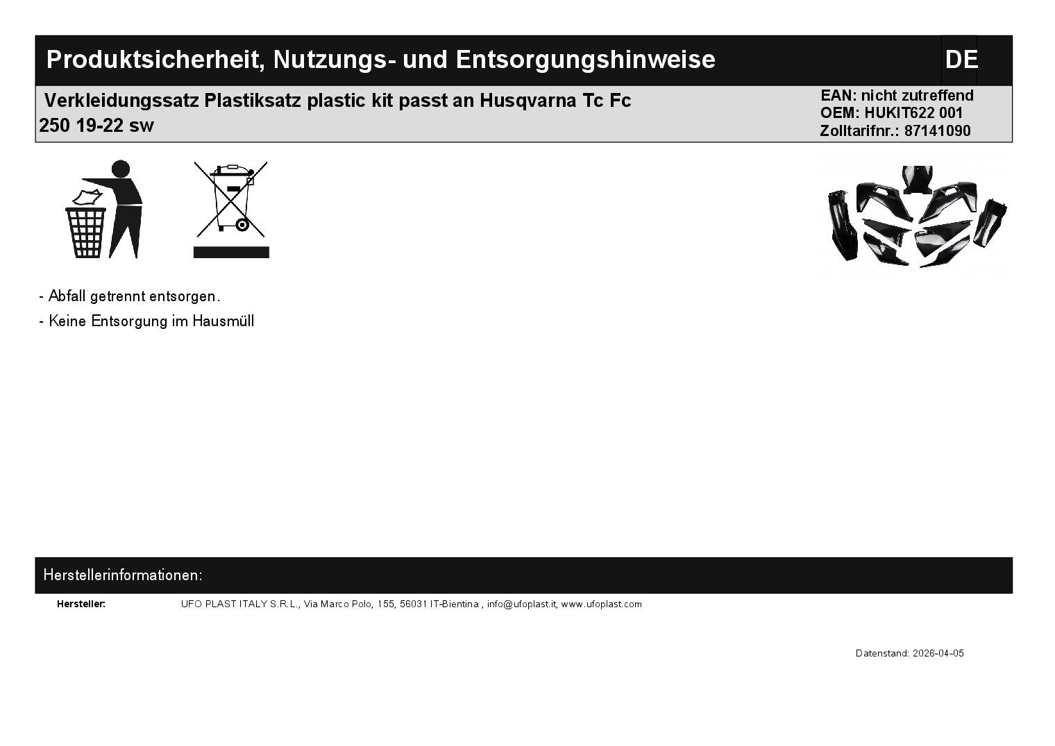 • Verkleidungssatz Plastiksatz plastic kit passt an Husqvarna Tc Fc 250 19-22 sw