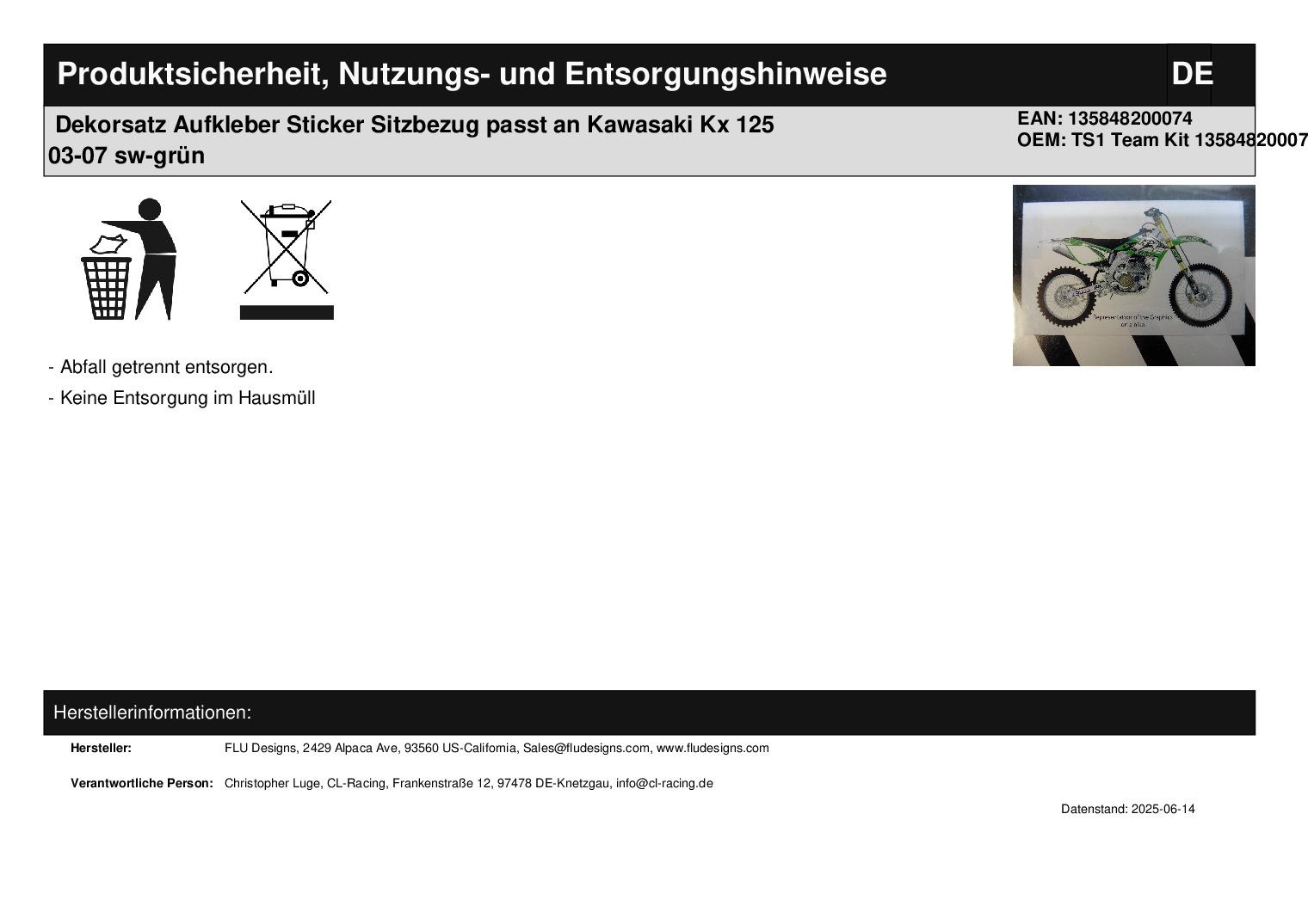 In dieser Auktion gibt es folgenden Artikel zu kaufen: Dekorsatz (siehe Foto) Modell: passend für Kawasaki KX 125 Bj.: 03 - 07 Lieferumfang: Dekor incl. Sitzbezug Artikelzustand: neu Bei Unklarheiten oder Fragen bitte erst E-Mail schreiben.