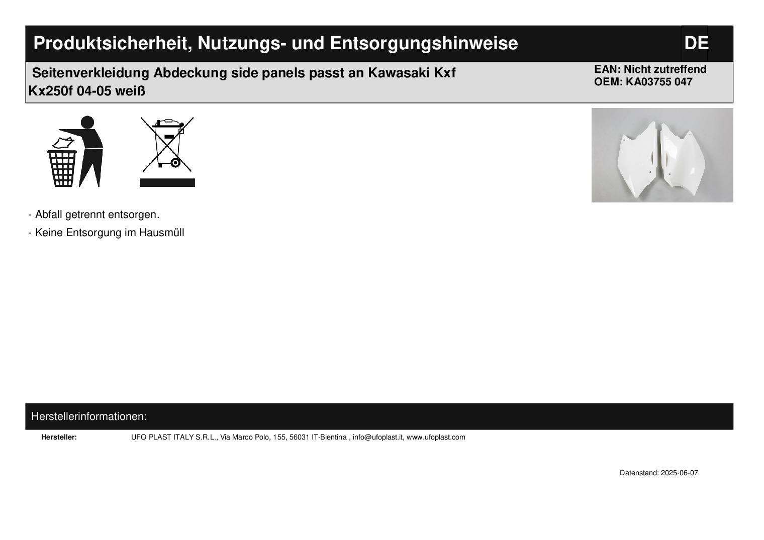 Seitenverkleidung Abdeckung side panels passt an Kawasaki Kxf Kx250f 04-05 weiß