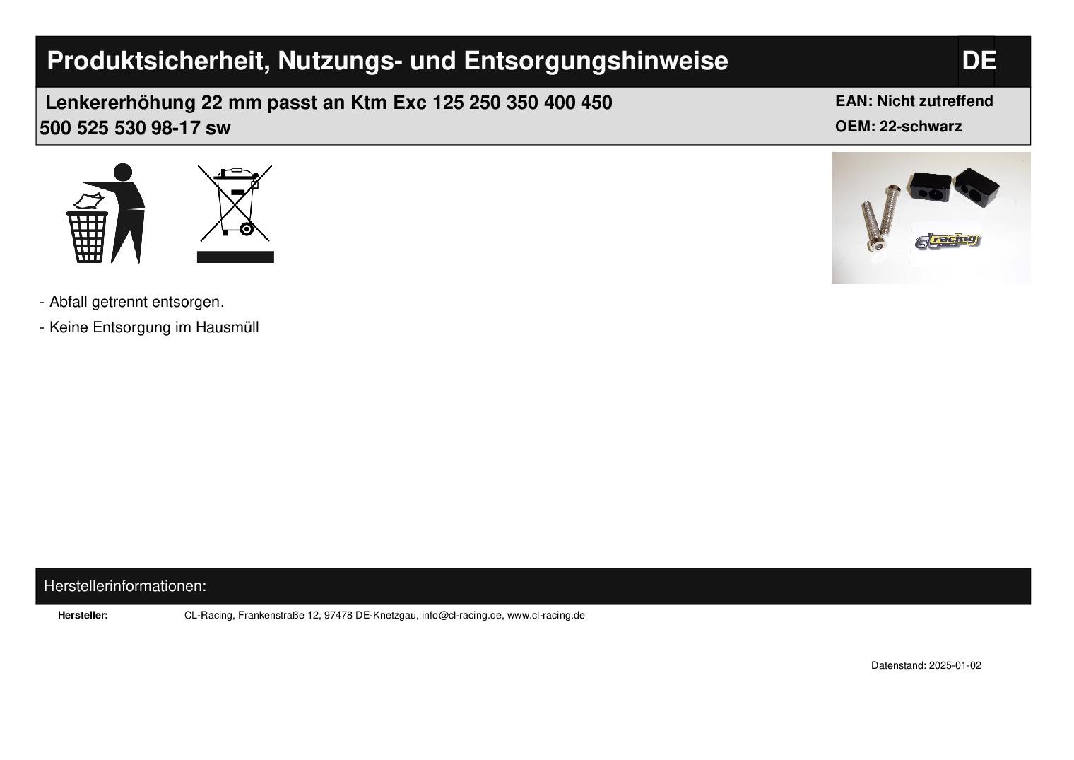• Lenkererhöhung 22 mm passt an Ktm Exc 125 250 350 400 450 500 525 530 98-17 sw