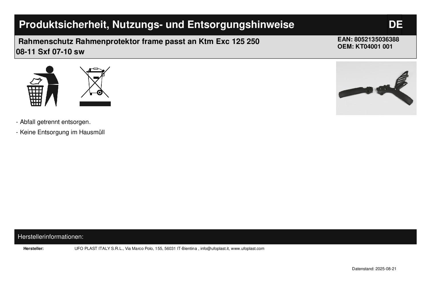 In dieser Auktion gibt es folgenden Artikel zu kaufen: Rahmenschutz (siehe Foto) Modell: passend für Ktm (2- und 4-Takt) Exc 125 200 250 300 400 450 Bj.: 2008 - 2011 Exc-f 250 Bj.: 2008 - 2011 Sx 125 Bj.: 2007 - 2010 Sx 150 Bj.: 2009 - 2010 Sx 250 Bj.: 2007 - 2010 Sxf 250 Bj.: 2007 - 2010 Sxf 450 Bj.: 2007 - 2010 Sxf 505 Bj.: 2007 - 2010 Artikelbeschreibung: - schützt den Rahmen in den belasteten Bereichen - schnelle, einfache Montage und Demontage durch Schnellverschlüsse (Kabelbinder) Lieferumfang: siehe Foto Artikelzustand: neu Es handelt sich hierbei um kein Originalteil Bei Unklarheiten oder Fragen bitte erst E-Mail schreiben.