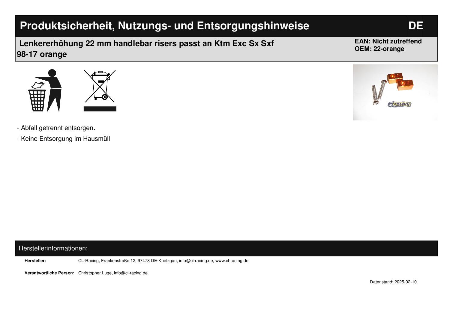 Lenkererhöhung KTM 22 mm orange - Lager -