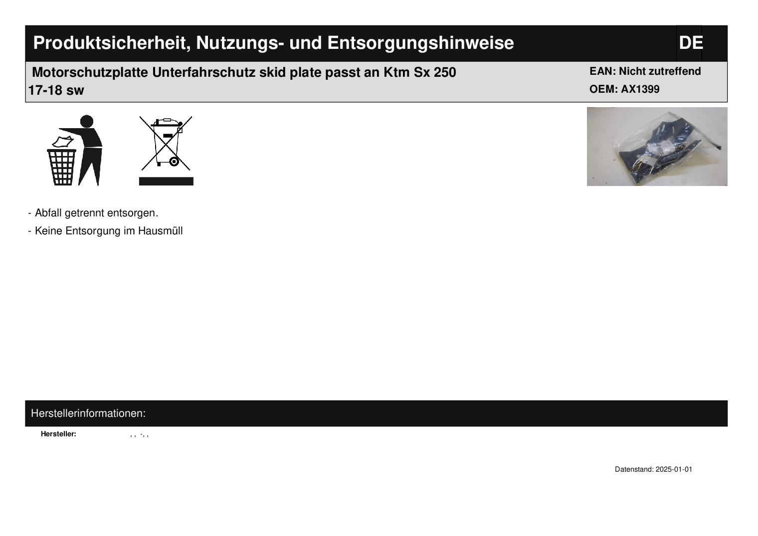 In dieser Auktion gibt es folgenden Artikel zu kaufen: Motorschutzplatte (siehe Foto) Modell: passend für Ktm SX 250 Bj.: 17 - 18 passend für Husqvarna TC 250 Bj.: 17 - 18 Lieferumfang: siehe Foto Artikelzustand: neu aus Geschäftsauflösung, mit leichten Lagerspuren; Zustand siehe Foto Es handelt sich hierbei um kein Originalteil Bei Unklarheiten oder Fragen bitte erst E-Mail schreiben.