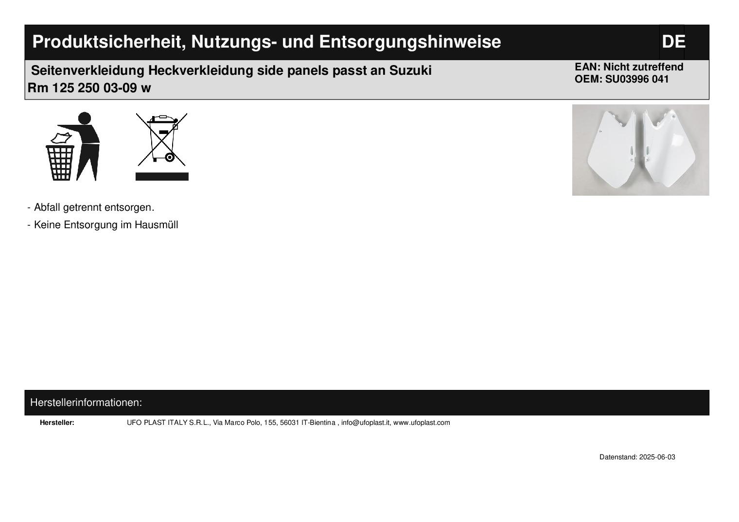 In dieser Auktion gibt es folgenden Artikel zu kaufen: Seitenverkleidung (siehe Foto) Fahrzeug: passend für Suzuki RM 125, 250 Bj.: 03 - 09 (2-Takt) Lieferumfang: siehe Foto Artikelzustand: neu aus Geschäftsauflösung, mit minimalen Lagerspuren; Zustand siehe Foto Bei Unklarheiten oder Fragen bitte erst E-Mail schreiben.