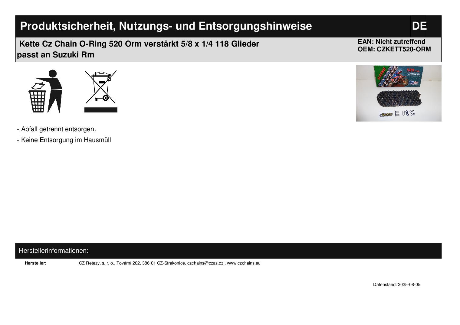 Titel: Kette Cz Chain O-Ring 520 Orm verstärkt 5/8 x 1/4 118 Glieder passt an Suzuki Rm