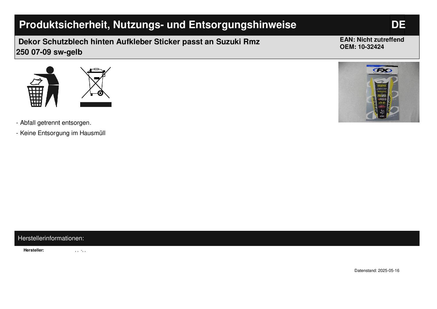 Titel: Dekor Schutzblech hinten Aufkleber Sticker passt an Suzuki Rmz 250 07-09 sw-gelb