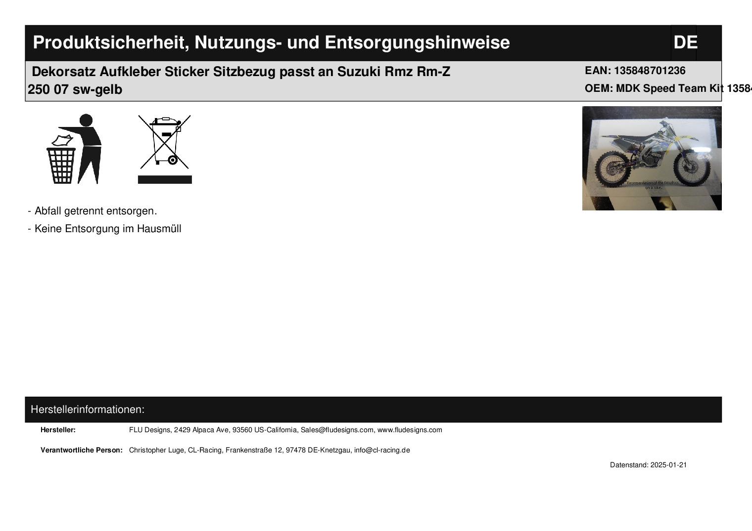 In dieser Auktion gibt es folgenden Artikel zu kaufen: Dekorsatz (siehe Foto) Modell: passend für Suzuki RMZ 250 Bj.: 07 Lieferumfang: Dekor incl. Sitzbezug Artikelzustand: neu Bei Unklarheiten oder Fragen bitte erst E-Mail schreiben.