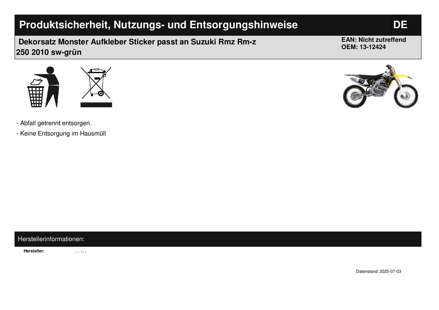 In dieser Auktion gibt es folgenden Artikel zu kaufen: Modell: passend für Suzuki Rmz 250 Bj.: 2010 Lieferumfang: siehe Foto Es werden nur die Aufkleber geliefert, die auf dem Foto zu sehen sind! Artikelzustand: neu aus Geschäftsauflösung, mit minimalen Lagerspuren; Zustand siehe Foto