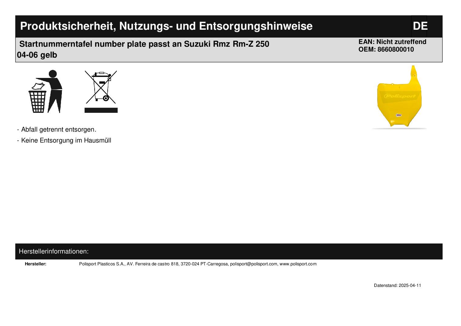 Titel: Startnummerntafel number plate passt an Suzuki Rmz Rm-Z 250 04-06 gelb
