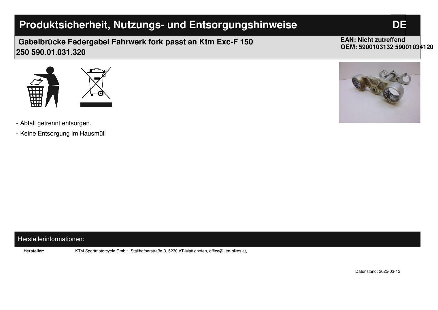 In dieser Auktion gibt es folgenden Artikel zu kaufen: originale Gabelbrücke (siehe Foto) Modell: passend für KTM EXC, EXC-F 125, 250, 300, 350, 450, 500 Bj.: 03 - 07 Lieferumfang: siehe Foto Artikelzustand: normale Gebrauchsspuren wie Kratzer und Anbauspuren vorhanden; Zustand siehe Foto Bei Unklarheiten oder Fragen bitte erst E-Mail schreiben.