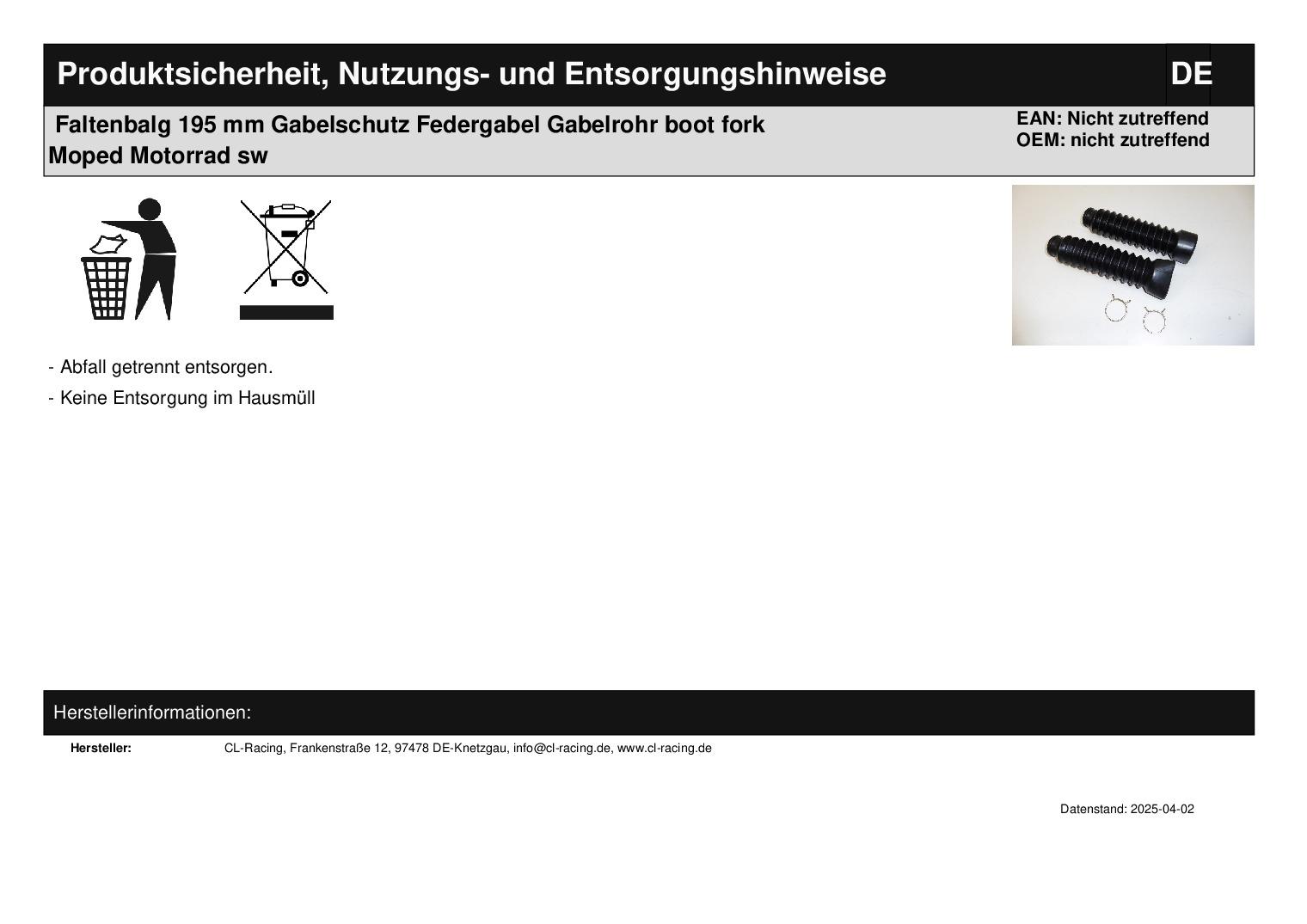 In dieser Auktion gibt es folgenden Artikel zu kaufen: Faltenbalg (siehe Foto) passend für: Durchmesser unten: ca. 43 mm Durchmesser oben: ca. 30 mm Länge: 195 mm Lieferumfang: 1 Paar Artikelzustand: neu Bei Unklarheiten oder Fragen bitte erst E-Mail schreiben.