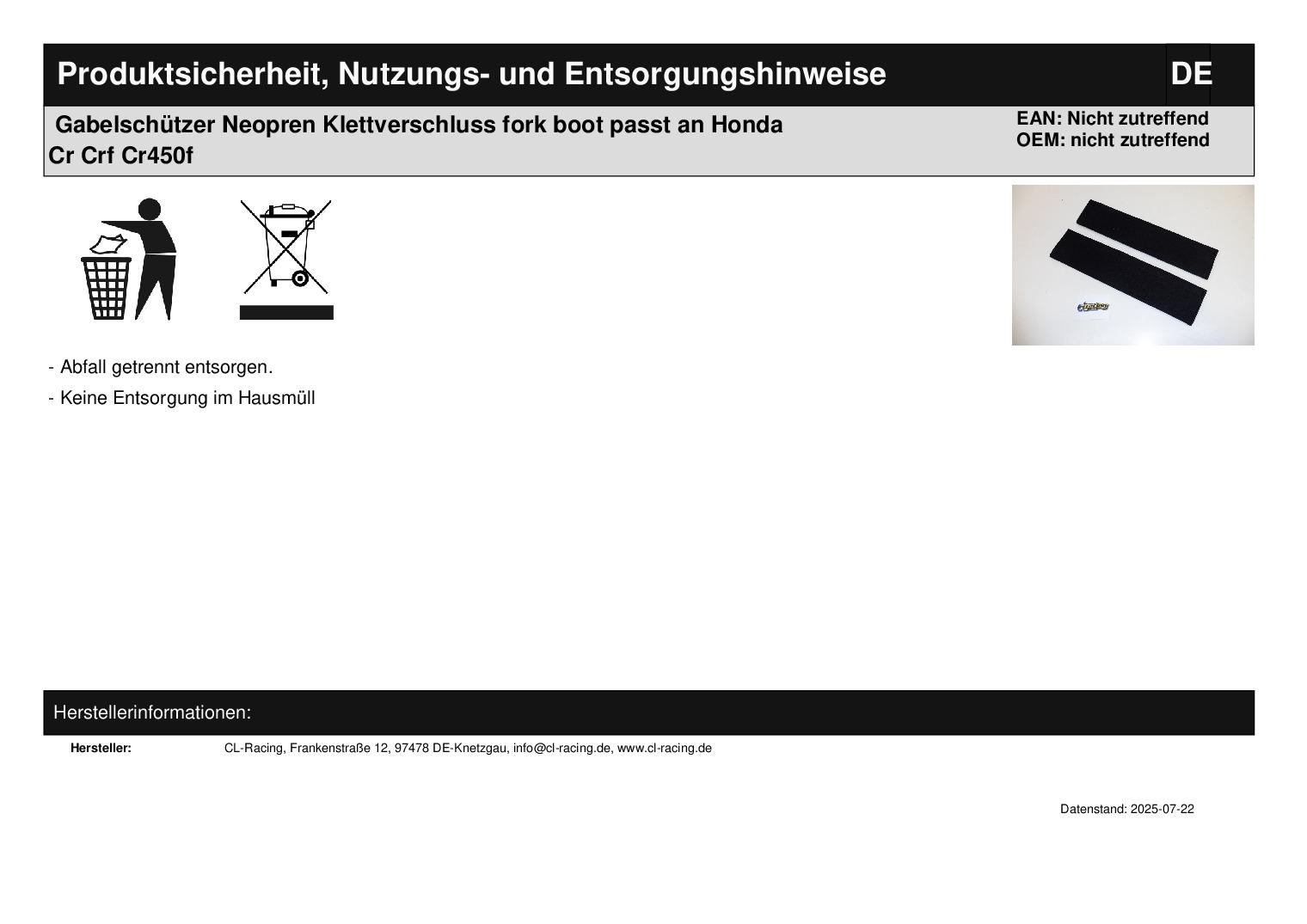 In dieser Auktion gibt es folgenden Artikel zu kaufen: Neopren Gabelschutz mit Klettverschluss passend fü r: alle gängigen Enduros und Crosser mit einem Gabeldurchmesser von Ø 43 - 50 mm Größe: Gabeldurchmesser = Ø 43 - 50 mm Länge = 350 mm (kann gekürzt werden) Artikelbeschreibung: Gabelschützer mit extra dicker Materialstärke von 3 mm wird durch Klettverschluss schnell über Tauchrohr montiert - schützt Tauchrohr und Gabeldichtringe vor Sand, Schlamm und Steinen! Lieferumfang: links + rechts Artikelzustand: neu Bei Unklarheiten oder Fragen bitte erst E-Mail schreiben.