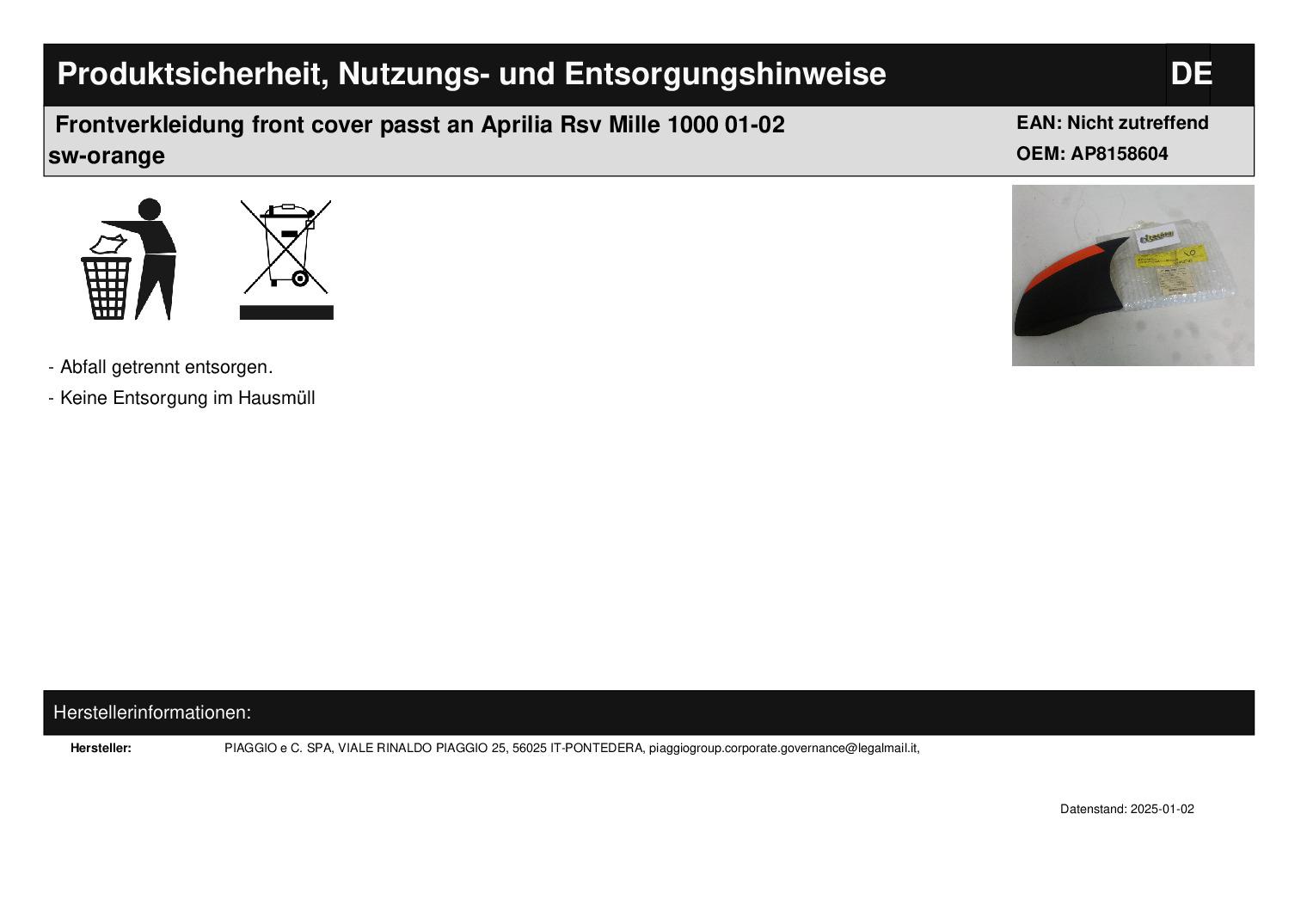 In dieser Auktion gibt es folgenden Artikel zu kaufen: Frontverkleidung (siehe Foto) Modell: passend für Aprilia RSV Mille 1000 Bj.: 2001 - 2002 Lieferumfang: siehe Foto Artikelzustand: neu aus Geschäftsauflösung, mit minimalen Lagerspuren; Zustand siehe Foto Bei Unklarheiten oder Fragen bitte erst E-Mail schreiben.