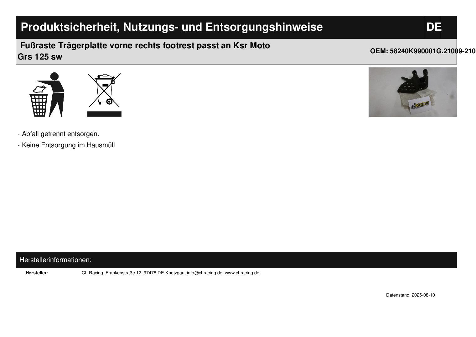 In dieser Auktion gibt es folgenden Artikel zu kaufen: Trägerplatte (siehe Foto) Modell: passend für KSR Moto GRS 125 Bj.: unbekannt Lieferumfang: siehe Foto Artikelzustand: neu aus Geschäftsauflösung, mit leichten Lagerspuren; Zustand siehe Foto Bei Unklarheiten oder Fragen bitte erst E-Mail schreiben.