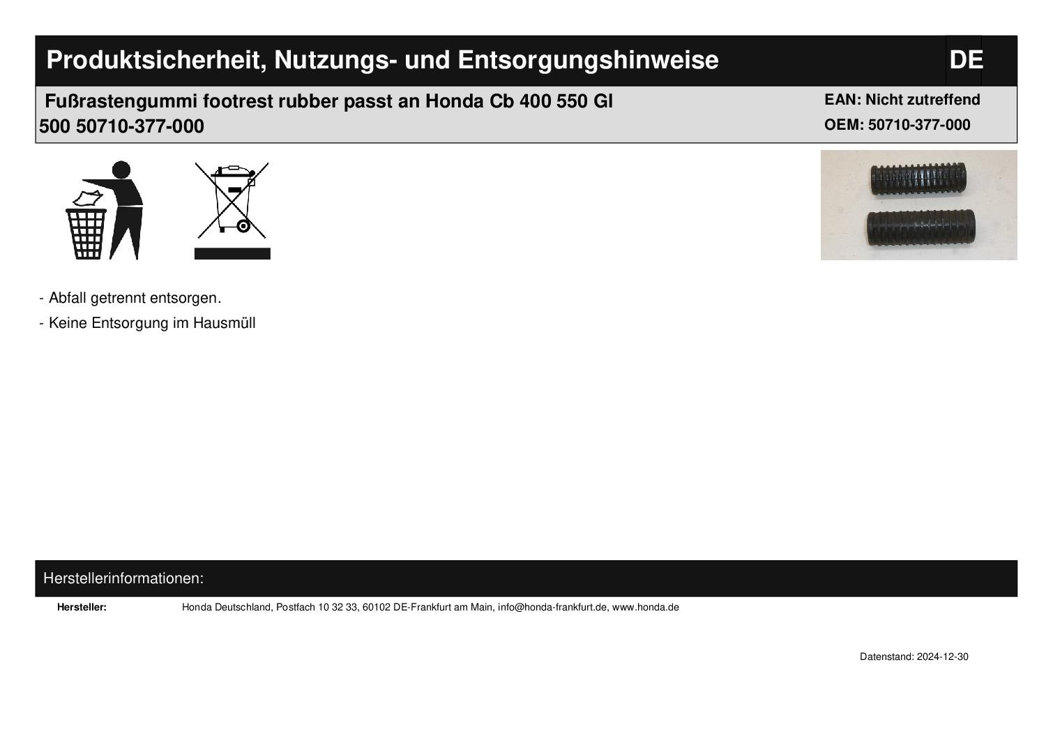 In dieser Auktion gibt es folgenden Artikel zu kaufen: Fußrastengummi (siehe Foto) Modell: passend für Honda CB 400 Bj.: 80 - 81 CB 550 Bj.: 76 - 78 GL 500 Bj.: 81 - 82 Lieferumfang: siehe Foto Artikelzustand: normale Gebrauchsspuren vorhanden; Zustand siehe Foto Bei Unklarheiten oder Fragen bitte erst E-Mail schreiben.