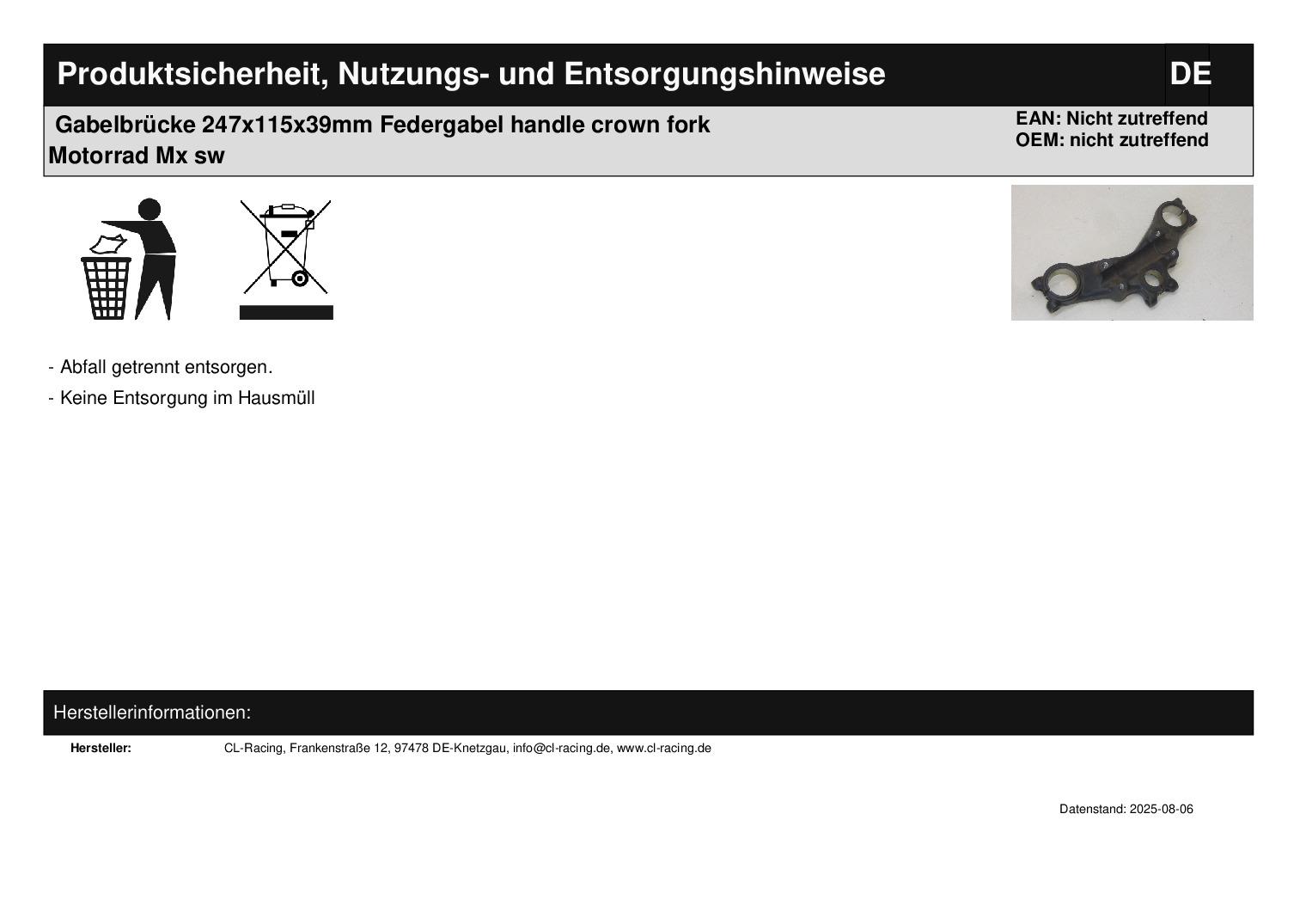 In dieser Auktion gibt es folgenden Artikel zu kaufen: Gabelbrücke (siehe Foto) Modell: unbekannt Bj.: unbekannt Details: Abmaße gesamt: ca. 247 mm breit x 115 mm hoch x 39 mm tief Innendurchmesser Löcher links und rechts: ca. 36 mm Innendurchmesser Loch in der Mitte: ca. 23 mm Lochabstand in der Breite: ca. 84 (Mitte Loch) Lochabstand in der Höhe: ca. 32 (Mitte Loch) Lieferumfang: 1 Stück Artikelzustand: leichte Gebrauchsspuren vorhanden; Zustand siehe Foto Bei Unklarheiten oder Fragen bitte erst E-Mail schreiben.