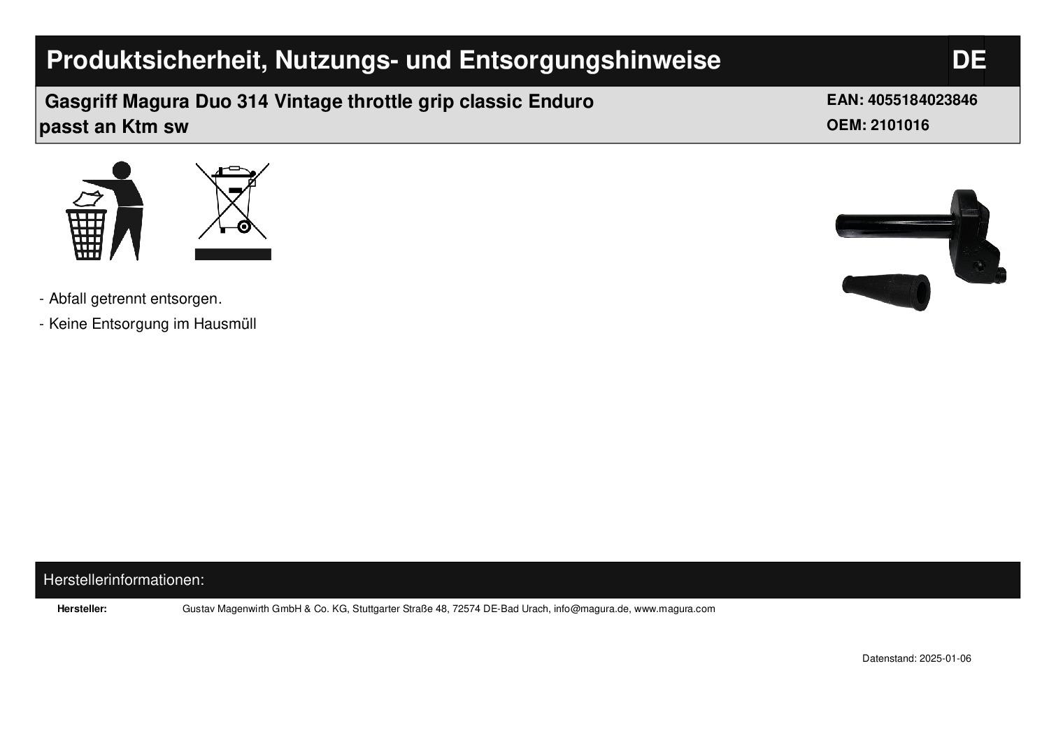 In dieser Auktion gibt es folgenden Artikel zu kaufen: Gasgriff (siehe Foto) Modell: universal Artikelbeschreibung: - einzügig - DUO einstellbar (Motocross oder Enduro) - Rundzug über Seilumlenkrolle - schwarzes Gehäuse aus glasfaserverstärktem Polycarbonat - Lieferung ohne Griffbezug - ohne Gehäusedemontage umbaubar in Enduro-Ausführung - Gesamthub 48 mm bei 103° bzw. 91° Drehwinkel - mit Kappe Lieferumfang: 1 Stück Artikelzustand: neu Es handelt sich hierbei um kein Originalteil Bei Unklarheiten oder Fragen bitte erst E-Mail schreiben.
