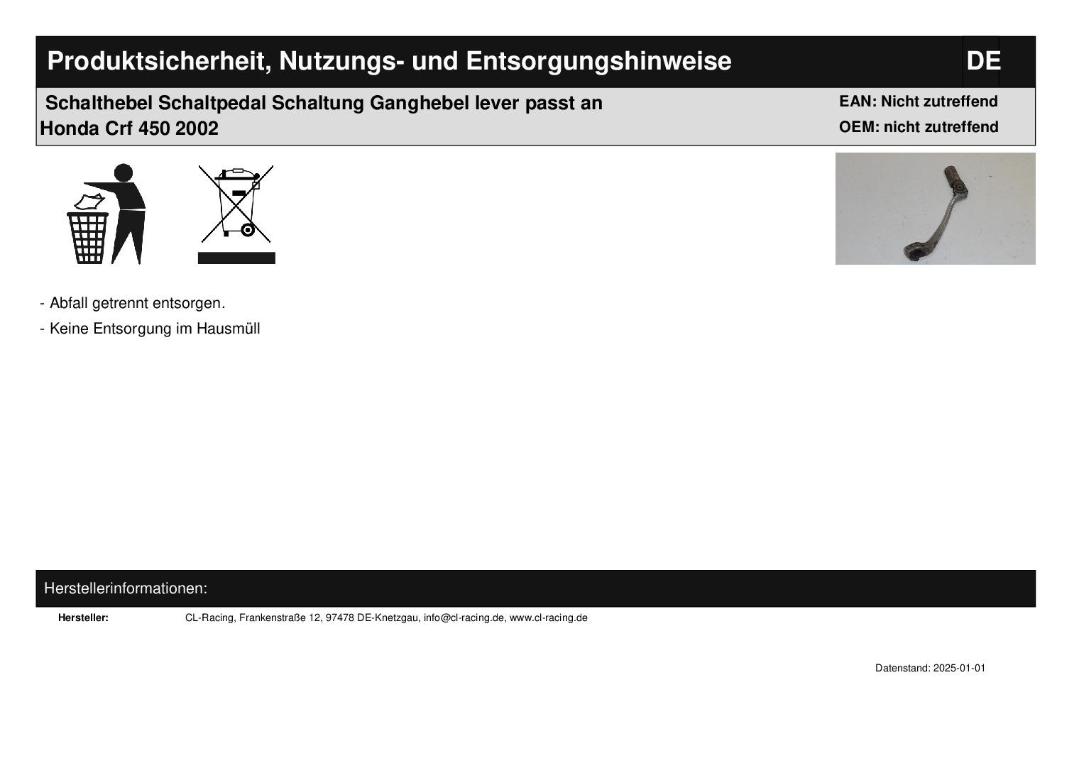 In dieser Auktion gibt es folgenden Artikel zu kaufen: Schalthebel (siehe Foto) Modell: passend für Honda CRF 450 Bj.: 02 Lieferumfang: siehe Foto Artikelzustand: gut erhalten, normale Gebrauchsspuren wie Kratzer vorhanden; Zustand siehe Foto Bei Unklarheiten oder Fragen bitte erst E-Mail schreiben.