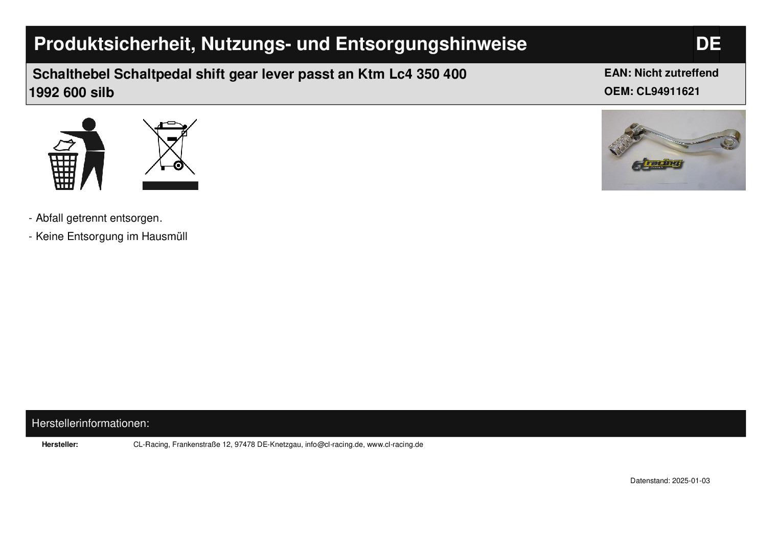 In dieser Auktion gibt es folgenden Artikel zu kaufen: klappbarer Schalthebel (siehe Foto) Modell: passend für Ktm Lc4 350 Bj.: 1992 (4-Takt) Lc4 400 Bj.: 1992 (4-Takt) Lc4 600 Bj.: 1988 (4-Takt) Lc4 620 Bj.: 1994 (4-Takt) Lc4 625 Bj.: 1999 (4-Takt) Lc4 640 Bj.: 1997 (4-Takt) Lc4 640 E Bj.: 2000 (4-Takt) Lc4 640 Adventure Bj.: 2003 (4-Takt) Lc4 640 Duke 2 Bj.: 2000 (4-Takt) Lc4 640 E Six Days Bj.: 2000 (4-Takt) Artikelbeschreibung: - qualitativ sehr hochwertiger Schalthebel; einfach gegen den originalen austauschbar - klappbares und gerändeltes Schaltgelenk - aus kaltgeschmiedetem 6061-T6-Aluminium für längeren Halt Lieferumfang: siehe Foto Artikelzustand: neu Es handelt sich hierbei um kein Originalteil Bei Unklarheiten oder Fragen bitte erst E-Mail schreiben.