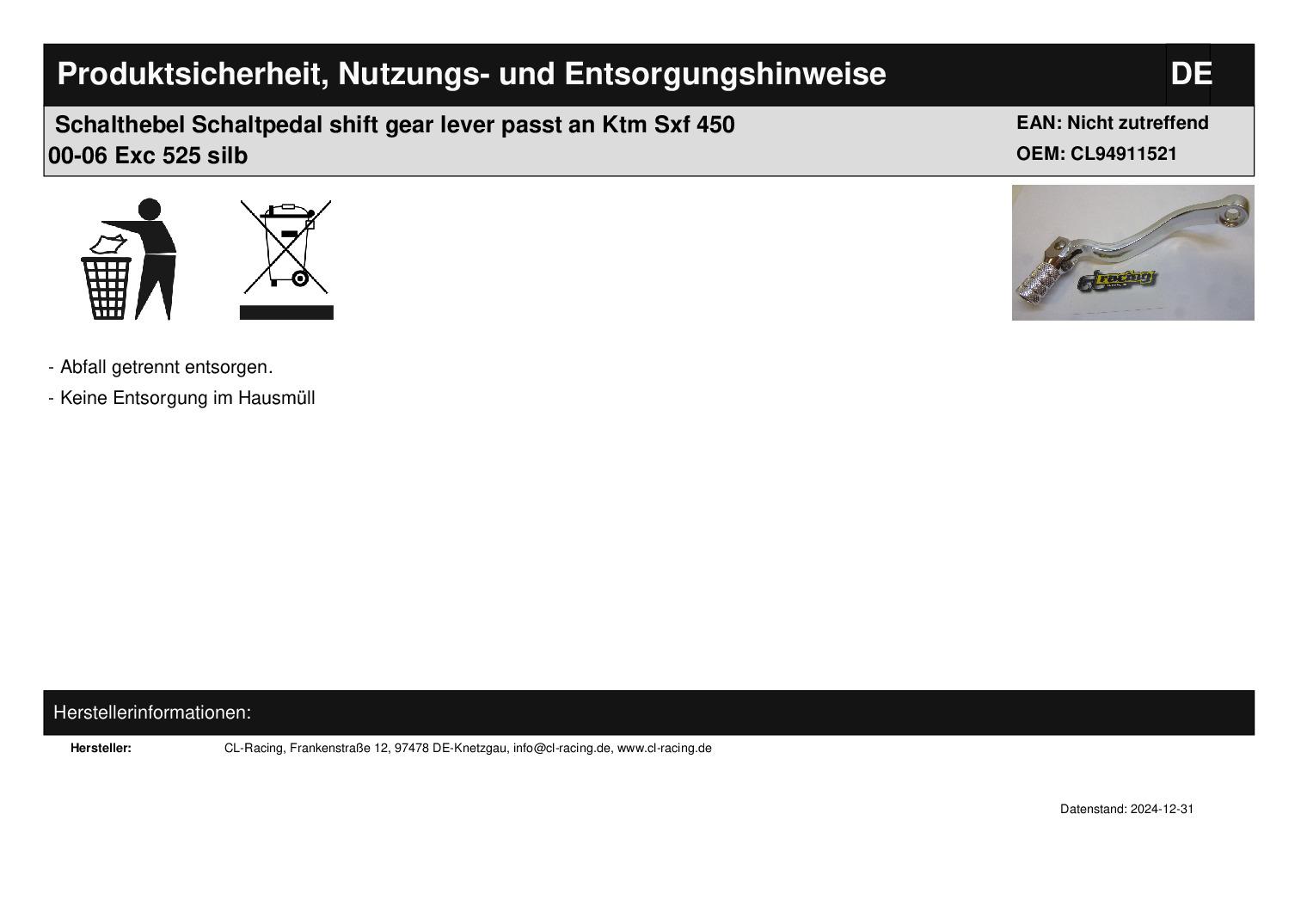 In dieser Auktion gibt es folgenden Artikel zu kaufen: klappbarer Schalthebel (ähnlich Foto) Modell: passend für Ktm Sx 250 Bj.: 2017-2022 XC 250, 300 Bj.: 2017-2022 XC-W 250, 300 Bj.: 2017-2023 XC-W 300 Six Days Bj.: 2017-2020 EXC 250, 300 Bj.: 2017-2023 EXC 250, 300 Six Days Bj.: 2017-2023 passend für Husqvarna TC 250 Bj.: 2017-2022 TE 250, 300 Bj.: 2017-2023 TX 300 Bj.: 2017-2022 passend für GasGas EG 250, 300 Bj.: 2021-2023 EX 250 Bj.: 2022-2023 EX 300 Bj.: 2021-2023 MC 250 2022-2023 Artikelbeschreibung: - qualitativ sehr hochwertiger Schalthebel; einfach gegen den originalen austauschbar - klappbares und gerändeltes Schaltgelenk - aus kaltgeschmiedetem 6061-T6-Aluminium für längeren Halt Lieferumfang: 1 Stück Artikelzustand: neu Es handelt sich hierbei um kein Originalteil! Bei Unklarheiten oder Fragen bitte erst E-Mail schreiben.