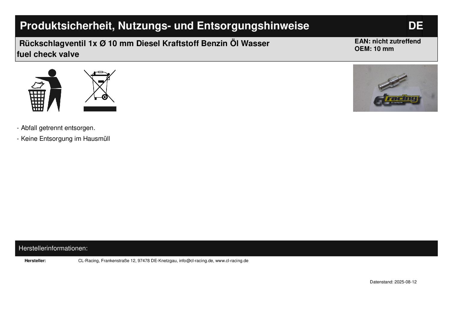 Rückschlagventil (siehe Foto) Artikelbeschreibung: verhindert den Rücklauf und Rückschlag von Flüssigkeiten, Fetten, Ölen, Benzin oder Gas Maße: Gesamtlä nge: 50 mm Anschlusslä nge: ca. 15 mm Anschlussdurchmesser: 10 mm Arbeitsbereich: 0 - 5 bar Öffnungsdruck: 0,2 bar Lieferumfang: 1 Stück Artikelzustand: neu Bei Unklarheiten oder Fragen bitte erst E-Mail schreiben.