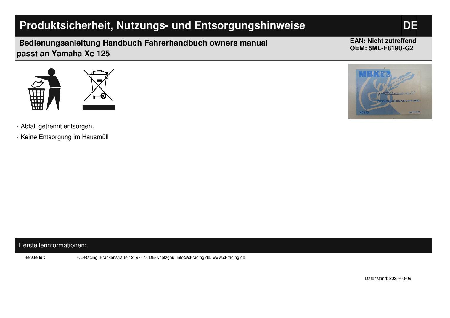 In dieser Auktion gibt es folgenden Artikel zu kaufen: gebrauchte Bedienungsanleitung (siehe Foto) Modell: passend für Yamaha XC 125 1. Ausgabe: September 2005 Sprachen: deutsch Lieferumfang: siehe Foto Artikelzustand: Buch ist in gutem Zustand; normale Gebrauchsspuren vorhanden; Zustand siehe Foto