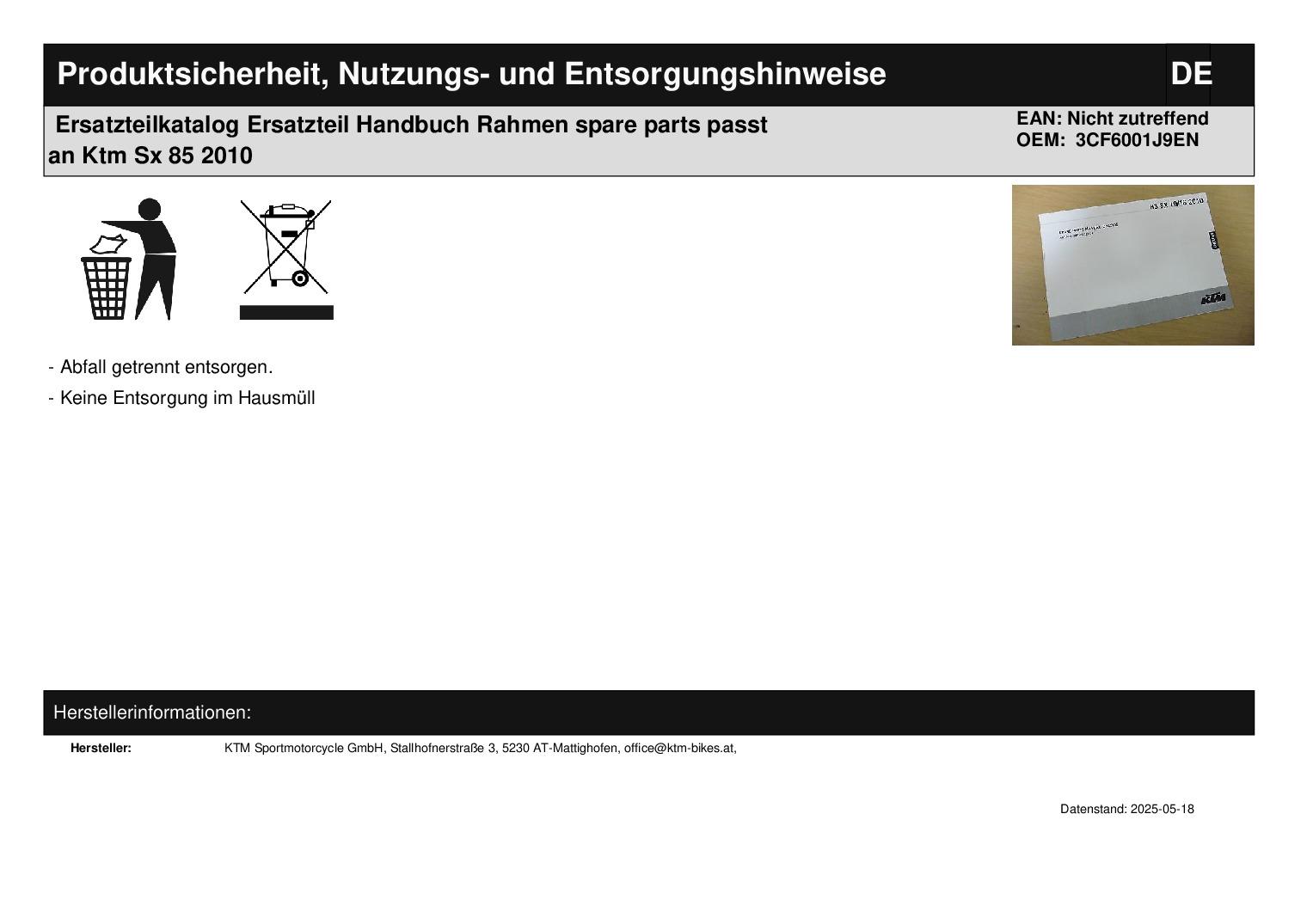 Ersatzteilkatalog Ersatzteil Handbuch Rahmen spare parts passt an Ktm Sx 85 2010