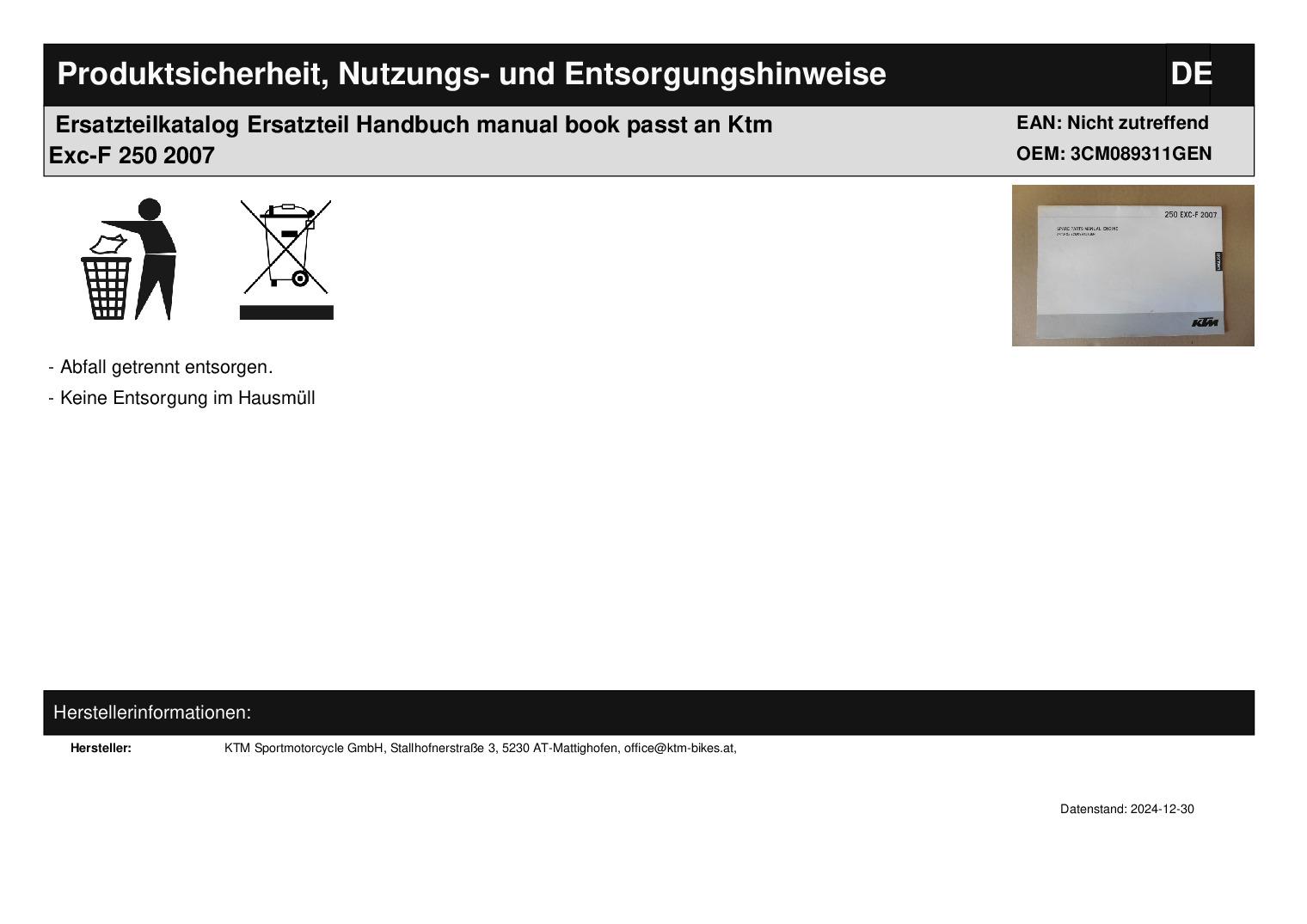 In dieser Auktion gibt es folgenden Artikel zu kaufen: gebrauchter Ersatzteilkatalog Motor (siehe Foto) Modell: passend für KTM EXC-F 250 (4-Takt) Baujahr: 2007 Sprachen: englisch Teilenummern und Explosionszeichnungen vorhanden! Lieferumfang: siehe Foto Artikelzustand: leichte Gebrauchsspuren vorhanden; Zustand siehe Foto