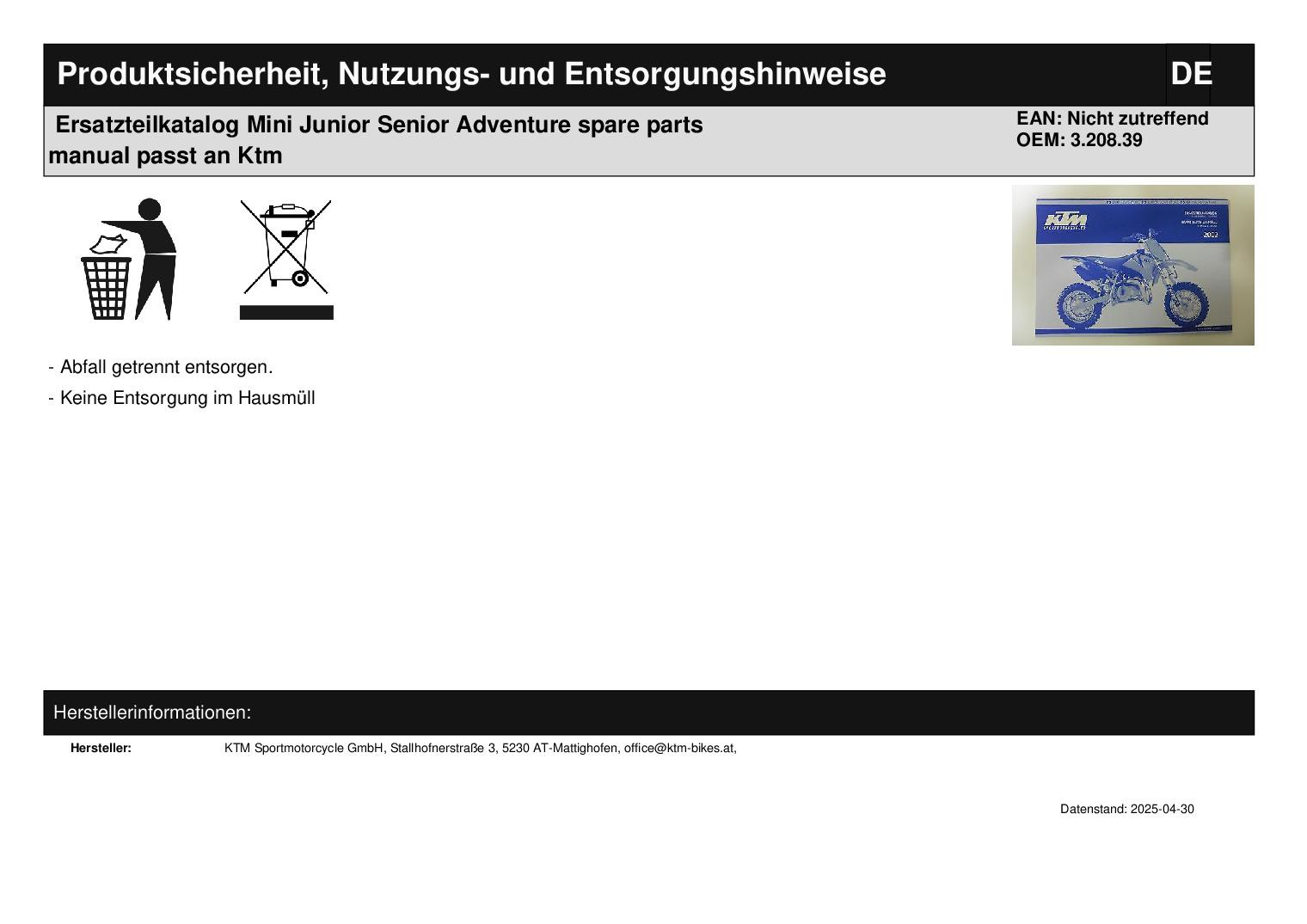 In dieser Auktion gibt es folgenden Artikel zu kaufen: Ersatzteilkatalog Fahrgestell + Motor (siehe Foto) Modell: passend für KTM 50 Mini Adventure/Junior Adventure/Senior Adventure Bj.: 2002 Sprachen: deutsch, englisch Lieferumfang: siehe Foto Artikelzustand: leichte Gebrauchsspuren vorhanden; Zustand siehe Foto Bei Unklarheiten oder Fragen bitte erst E-Mail schreiben.