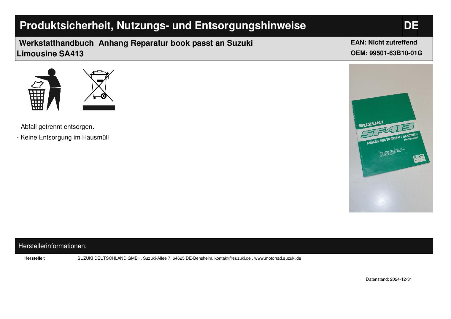 In dieser Auktion gibt es folgenden Artikel zu kaufen: Anhang zum Werkstatt-Handbuch mit Schaltplan (siehe Foto) Modell: passend für Suzuki SA413 Sprachen: deutsch 1. Ausgabe: Juli 1989 Lieferumfang: siehe Foto Artikelzustand: leichte Gebrauchsspuren auf dem Umschlag vorhanden; Zustand siehe Foto Bei Unklarheiten oder Fragen bitte erst E-Mail schreiben.