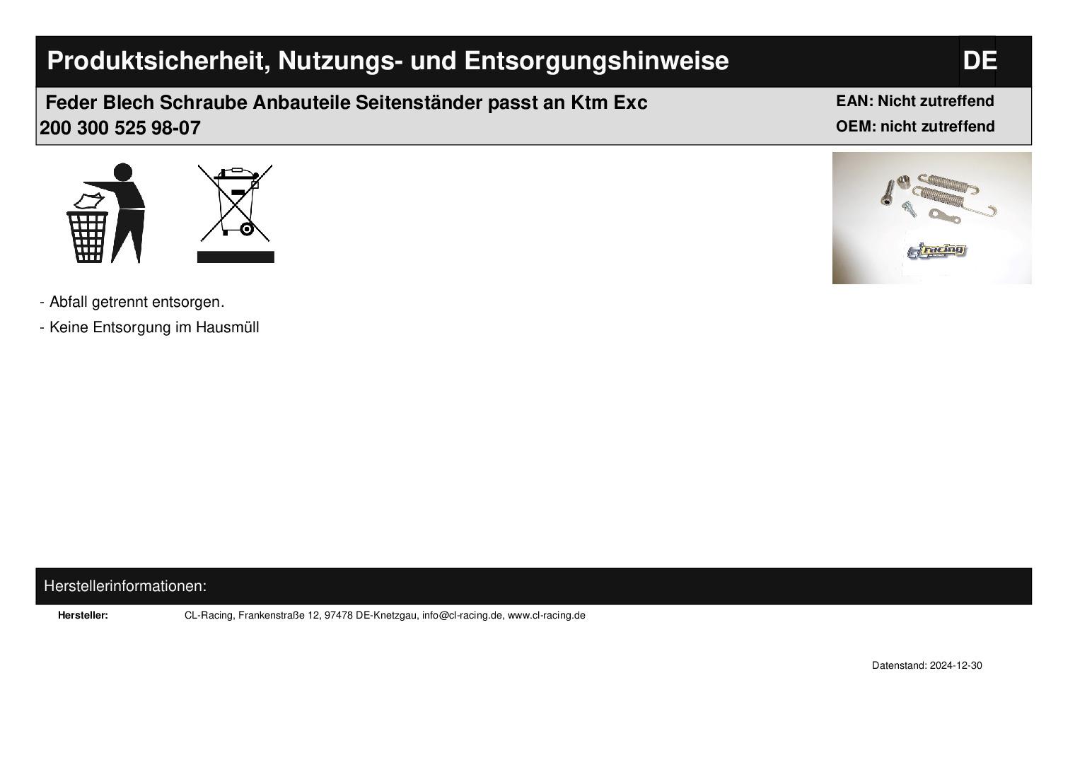 In dieser Auktion gibt es folgenden Artikel zu kaufen: ein Satz Anbauteile für Seitenständer (siehe Foto) Modell: passend für Ktm Exc 125 - 525 (2- und 4-Takt) Bj.: 1998 - 2007 Lieferumfang: 1 x Blech, 1 x Schraube zum Einhängen d. Federn, 2 x Feder (siehe Foto!) Artikelzustand: neu Es handelt sich hierbei um kein Originalteil! Bei Unklarheiten oder Fragen bitte erst E-Mail schreiben.