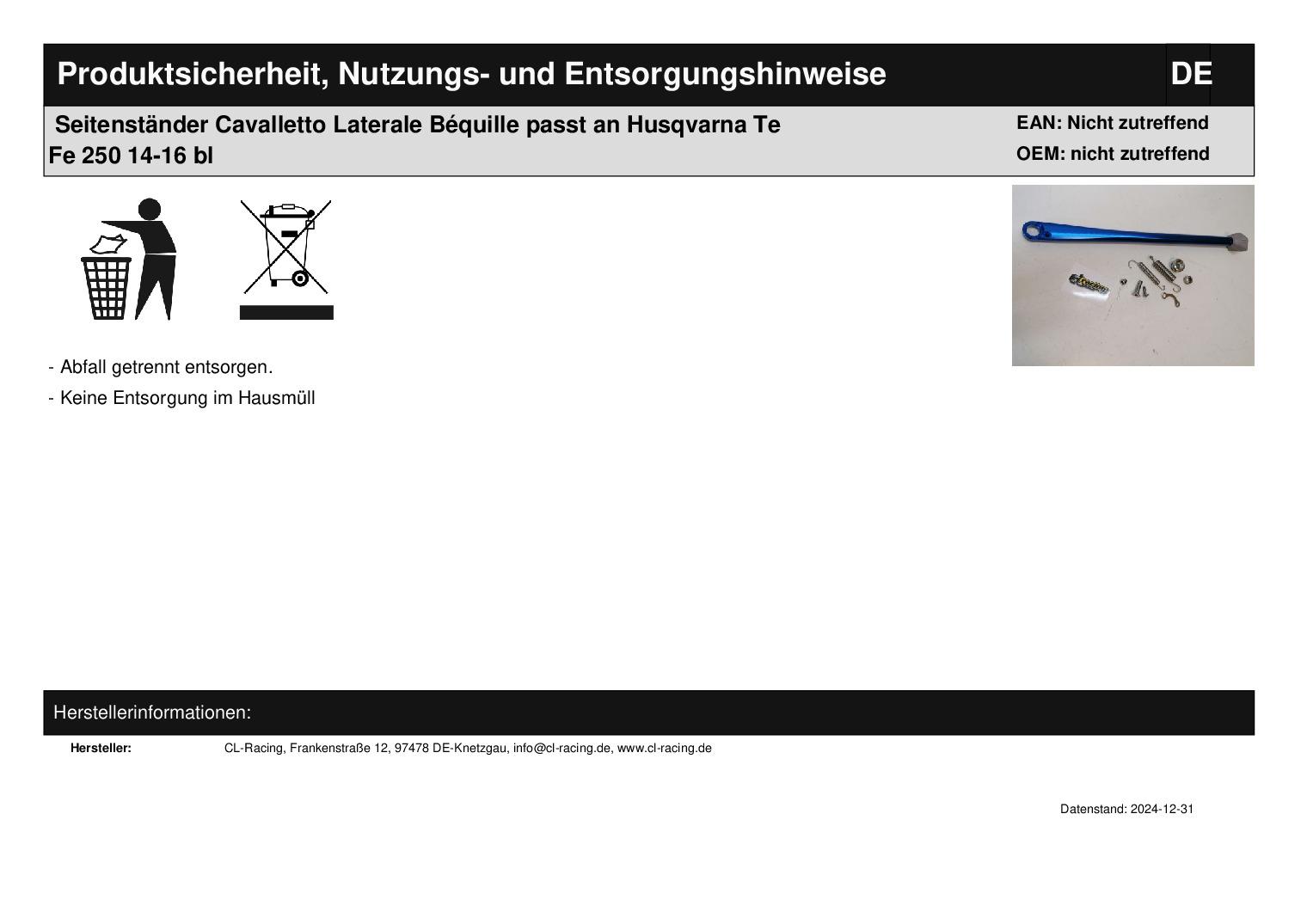 In dieser Auktion gibt es folgenden Artikel zu kaufen: hochwertiger Seitenständer inklusive Anbauteile (siehe Foto) Modell: passend für Ktm EXC 125, 200, 250, 300, 400 Bj.: 2008 - 2016 (2-Takt) EXC 450, 500 Bj.: 2011 - 2016 EXC-R 450, 530 Bj.: 2008 - 2011 EXC-F 250 Bj.: 2008 - 2016 EXC-F 350 Bj.: 2012 - 2016 Freeride 2012 - 2016 XC-F 250 F, 350 F Bj.: 2011 - 2016 passend für Husaberg TE 125, 250, 300 Bj.: 2009 - 2014 FE 250, 350, 450, 501 Bj.: 2009 - 2014 passend für Husqvarna FE 250 Bj.: 2014 - 2016 FE 350 Bj.: 2014 - 2016 FE 450 Bj.: 2014 - 2016 FE 501 Bj.: 2014 - 2016 TE 125 Bj.: 2014 - 2016 TE 250 Bj.: 2014 - 2016 TE 300 Bj.: 2014 - 2016 Lieferumfang: Seitenständer + Anbauteile (siehe Foto) Artikelzustand: neu Es handelt sich hierbei um kein Originalteil Bei Unklarheiten oder Fragen bitte erst E-Mail schreiben.
