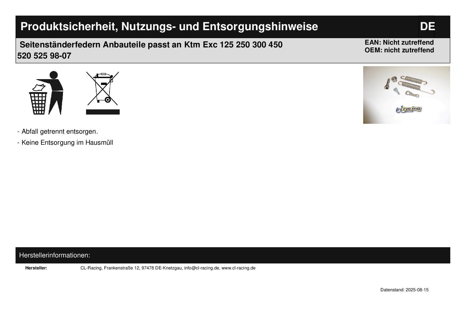 In dieser Auktion gibt es folgenden Artikel zu kaufen: ein Satz Anbauteile für Seitenständer (siehe Foto) Modell: passend für Ktm Exc 125 - 525 (2- und 4-Takt) Bj.: 1998 - 2007 Lieferumfang: 1 x Blech, 1 x Schraube zum Einhängen d. Federn, 2 x Feder (siehe Foto) Artikelzustand: neu Es handelt sich hierbei um kein Originalteil Bei Unklarheiten oder Fragen bitte erst E-Mail schreiben.
