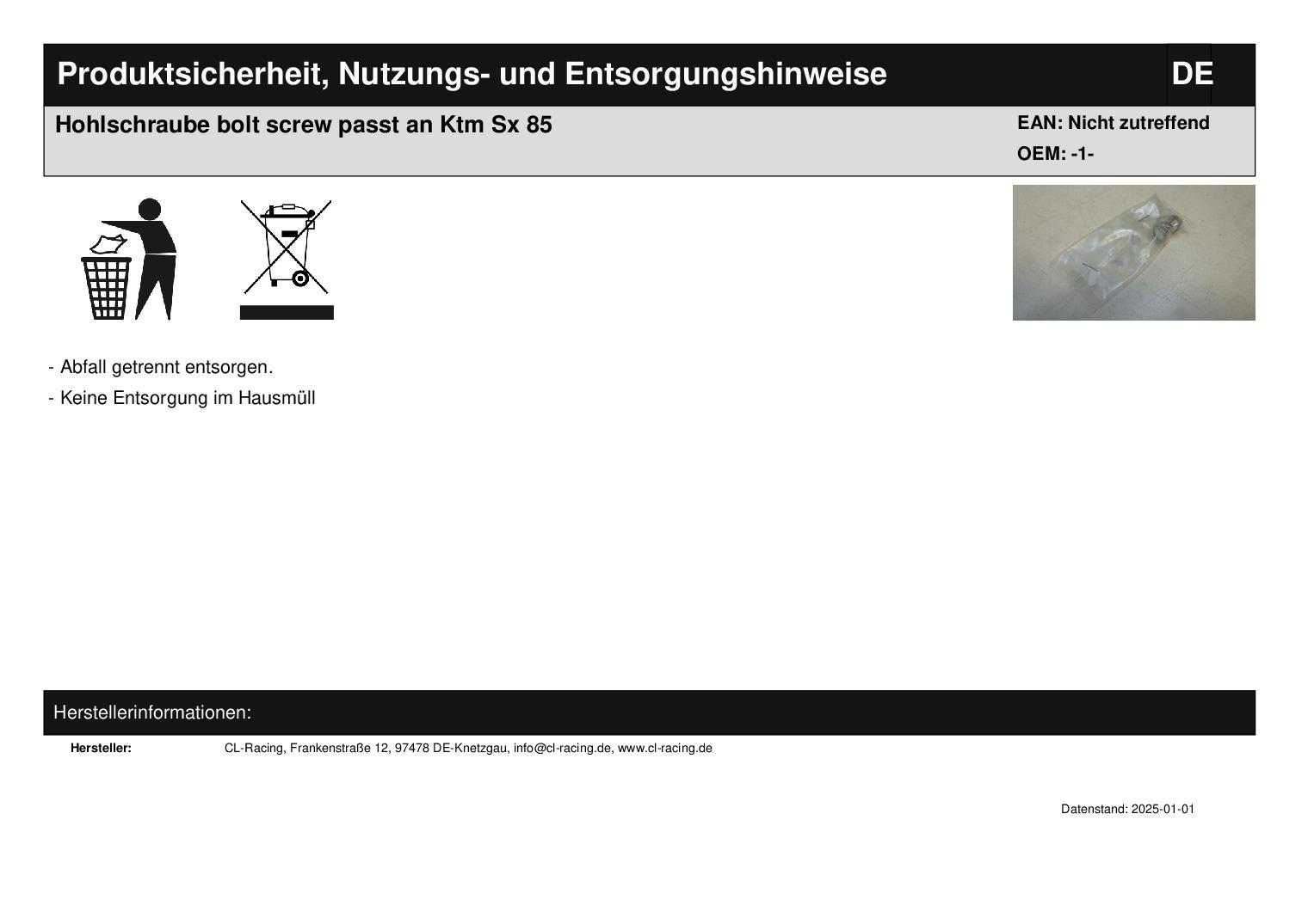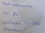 In dieser Auktion gibt es folgenden Artikel zu kaufen: Hohlschrauben (siehe Foto) Modell: passend für Ktm SX 85 Bj.: unbekannt Lieferumfang: 1 Stück Artikelzustand: neu aus Geschäftsauflösung, mit leichten Lagerspuren; Zustand siehe Foto Bei Unklarheiten oder Fragen bitte erst E-Mail schreiben. Es handelt sich hierbei um kein Originalteil