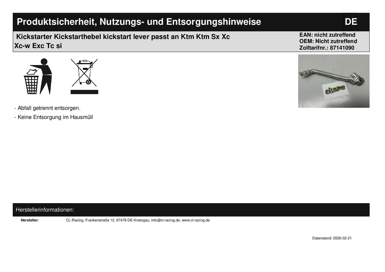 In dieser Auktion gibt es folgenden Artikel zu kaufen: Kickstarter (ähnlich Foto) Modell: passend für KTM SX 125, 150 Bj.: 2016 – 2022 XC 125 Bj.: 2021 – 2022 XC 250, 300 Bj.: 2017 – 2019 XC-W 125, 250, 300 Bj.: 2017 – 2019 XC-W 150 Bj.: 2017 – 2023 EXC 150 Bj.: 2020 – 2023 EXC 250, 300 Bj.: 2017 – 2019 passend für Husqvarna TC 125 Bj.: 2016 – 2022 TE 150 Bj.: 2017 – 2023 TE 250, 300 Bj.: 2017 – 2019 TX 125, 300 Bj.: 2017 – 2019 passend für GasGas MC 125 Bj.: 2021 – 2023 Lieferumfang: 1 Stück Artikelzustand: neu Es handelt sich hierbei um kein Originalteil! Bei Unklarheiten oder Fragen bitte erst E-Mail schreiben.