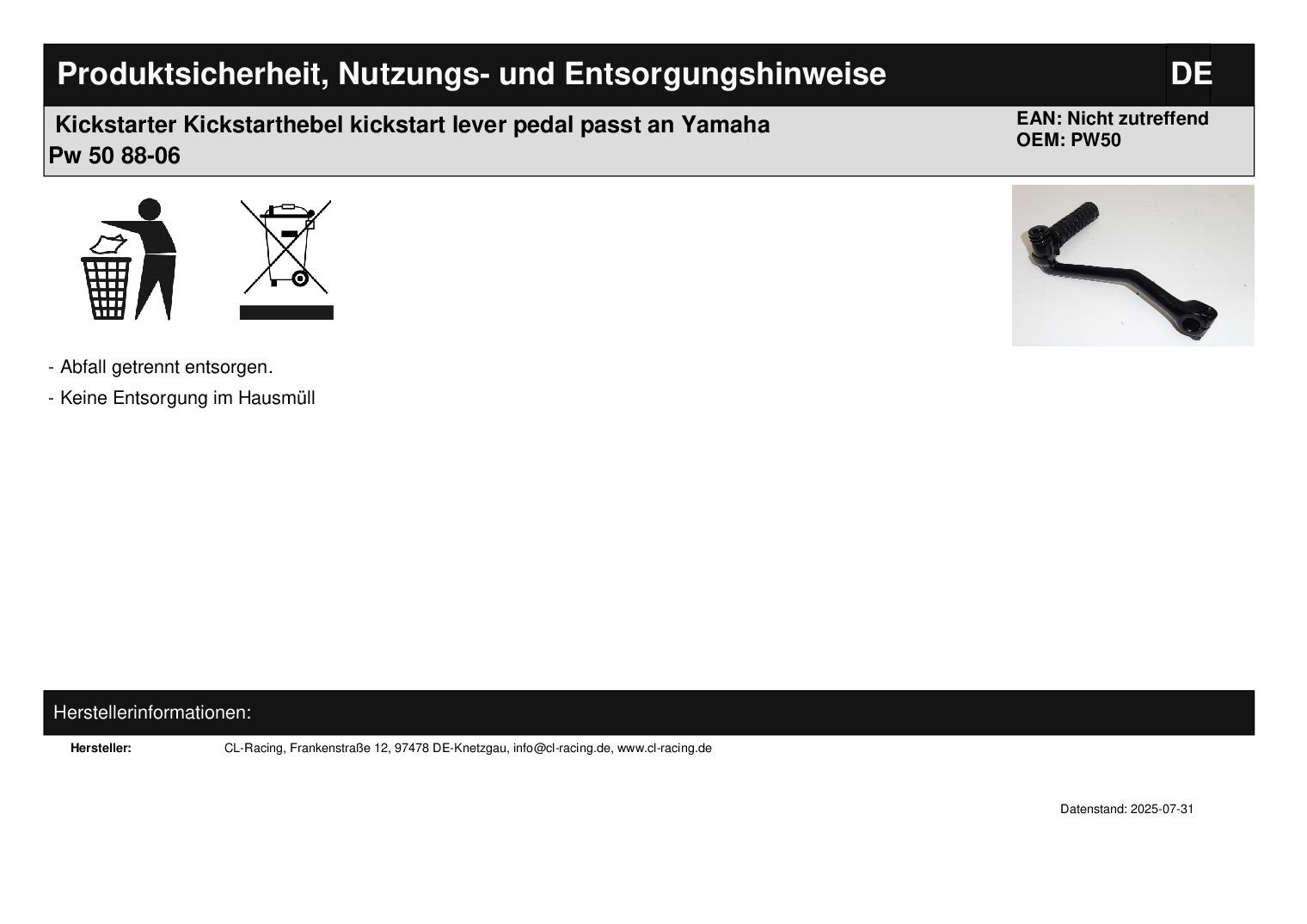 In dieser Auktion gibt es folgenden Artikel zu kaufen: Kickstarter aus dem Zubehör (siehe Foto) Modell: passend für Yamaha PW 50 Bj.: 1988 - 2006 Lieferumfang: siehe Foto Artikelzustand: neu aus Geschäftsauflösung, mit leichten Lagerspuren; Zustand siehe Foto Bei Unklarheiten oder Fragen bitte erst E-Mail schreiben.