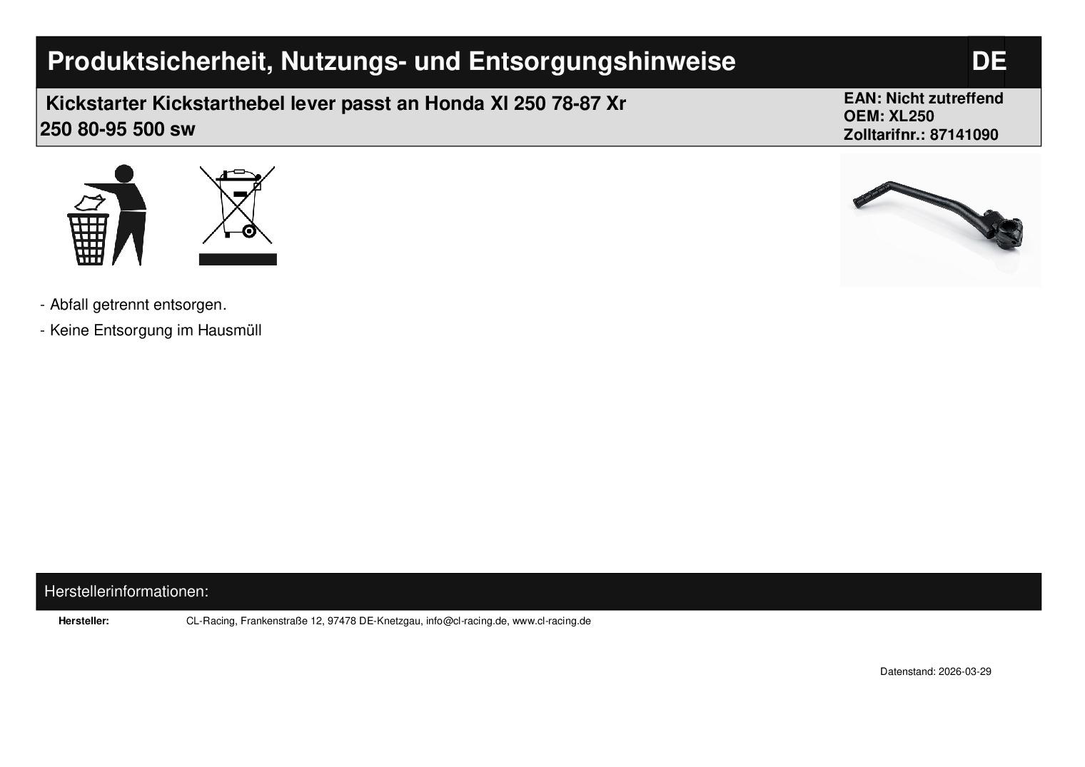 In dieser Auktion gibt es folgenden Artikel zu kaufen: Kickstarter Ø 16 mm (ähnlich Foto) Modell: passend für Honda XR 200 Bj.: 1984 - 1985 (4-Takt) XR 250 Bj.: 1980 - 1995 (4-Takt) XR 500 Bj.: 1980 - 1985 (4-Takt) XL 250 Bj.: 1978 - 1987 (4-Takt) Lieferumfang: 1 Stück Artikelzustand: neu Es handelt sich hierbei um kein Originalteil! Bei Unklarheiten oder Fragen bitte erst E-Mail schreiben.