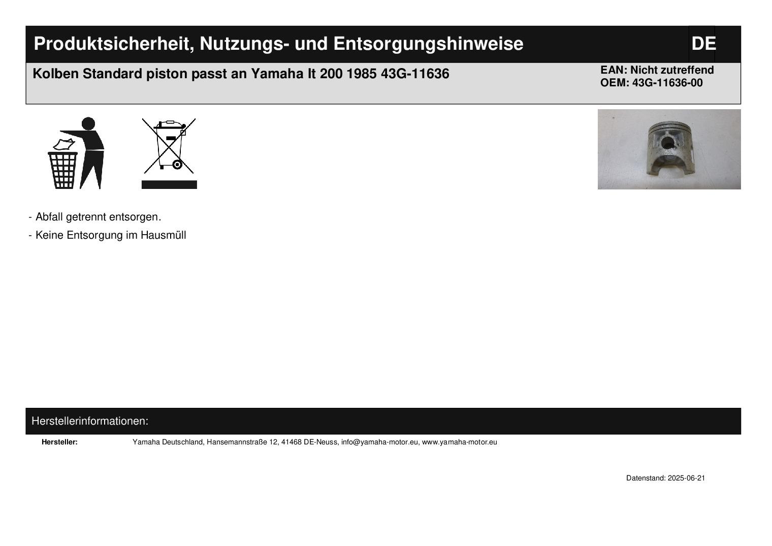 In dieser Auktion gibt es folgenden Artikel zu kaufen: Kolben (siehe Foto) Modell: passend für Yamaha IT 200 Bj.: 85 Kolbenmaß: Standard Lieferumfang: Kolben Artikelzustand: neu aus Geschäftsauflösung, mit leichten Lagerspuren; Zustand siehe Foto Bei Unklarheiten oder Fragen bitte erst E-Mail schreiben.