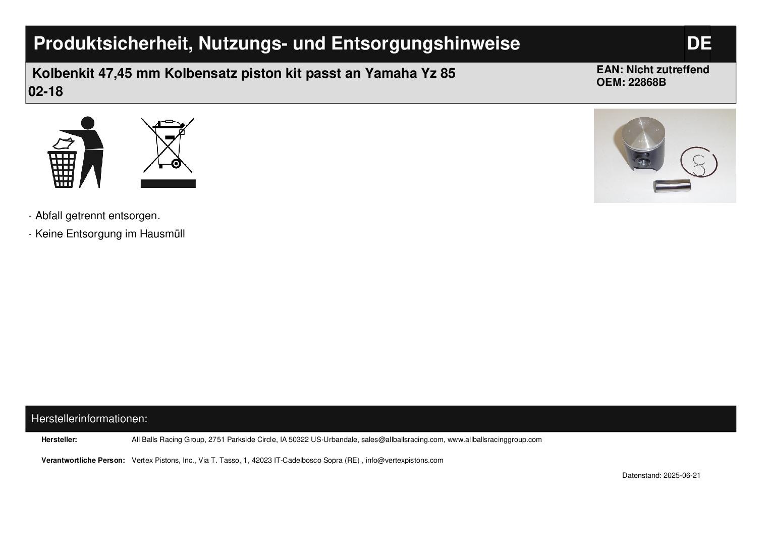 In dieser Auktion gibt es folgenden Artikel zu kaufen: Kolbenkit (siehe Foto) Modell: passend für Yamaha YZ 85 Bj.: 02 - 18 Kolbenmaß: 47,45 mm Lieferumfang: Kolben, Kolbenringe, Kolbenbolzen und Sicherungsringe Artikelzustand: neu aus Geschäftsauflösung, mit minimalen Lagerspuren; Zustand siehe Foto Bei Unklarheiten oder Fragen bitte erst E-Mail schreiben.