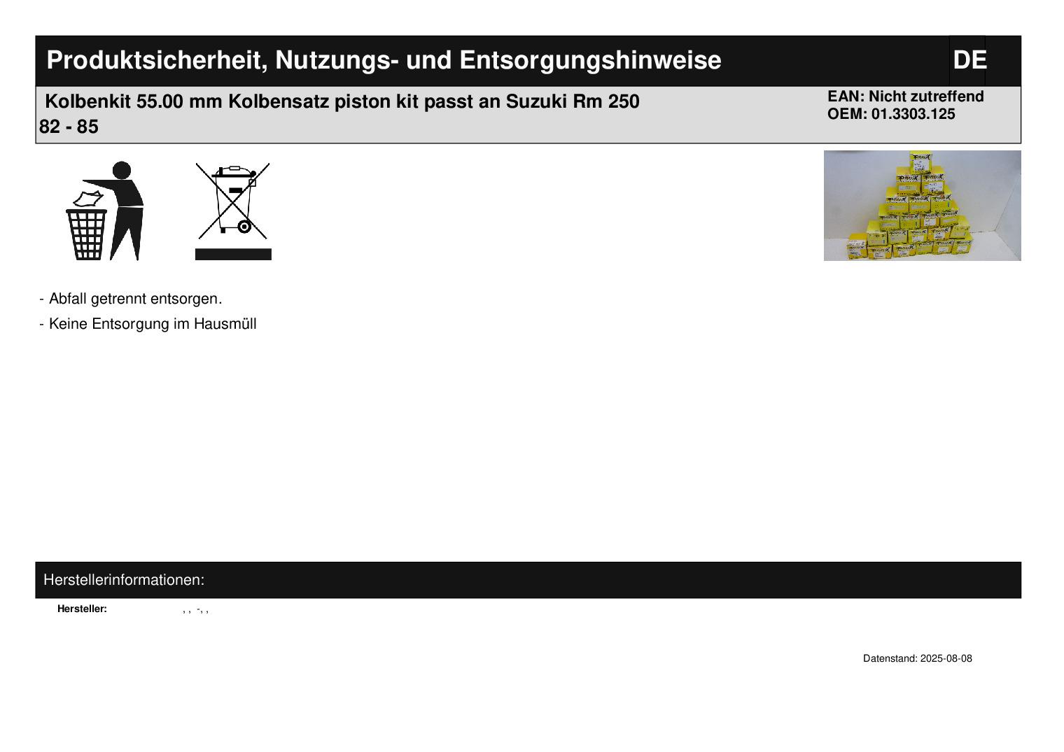 In dieser Auktion gibt es folgenden Artikel zu kaufen: Kolbenkit (siehe Foto) Modell: passend für Suzuki RM 250 Bj.: 82 - 85 Kolbenmaß: 55,00 mm Lieferumfang: Kolben, Kolbenringe, Kolbenbolzen und Sicherungsringe Artikelzustand: neu aus Geschäftsauflösung, mit minimalen Lagerspuren; Zustand ähnlich Foto Bei Unklarheiten oder Fragen bitte erst E-Mail schreiben.