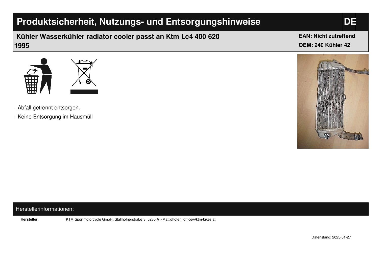 In dieser Auktion gibt es folgenden Artikel zu kaufen: Kühler (siehe Foto) Modell: passend für KTM Lc4 620 Bj.: 95 Teilenummer: 240 (seitlich auf dem Kühler eingeprägt) Lieferumfang: siehe Foto Artikelzustand: starke Gebrauchsspuren vorhanden; Kühler wird als defekt verkauft, da er verdrückt ist; er ist aber dicht; Zustand siehe Foto Bei Unklarheiten oder Fragen bitte erst E-Mail schreiben.