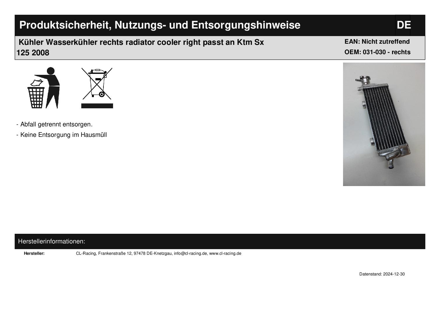 In dieser Auktion gibt es folgenden Artikel zu kaufen: rechter Zubehör-Kühler (siehe Foto) Fahrzeug: passend für Ktm Sx 125 Bj.: 2008 (2-Takt) (evtl. auch für andere Modelle; einfach Kühlernummer vergleichen!) Artikelbeschreibung: - optimale Passform; keine Modifikationen erforderlich - stabiler als Originalkühler, ca. 33 % mehr Durchflussmenge durch größere Oberfläche - Kühler werden im TIG-Schweißverfahren gefertigt und bieten die bestmögliche Qualität und Haltbarkeit Lieferumfang: 1 Stück Artikelzustand: neu Bei Unklarheiten oder Fragen bitte erst E-Mail schreiben.