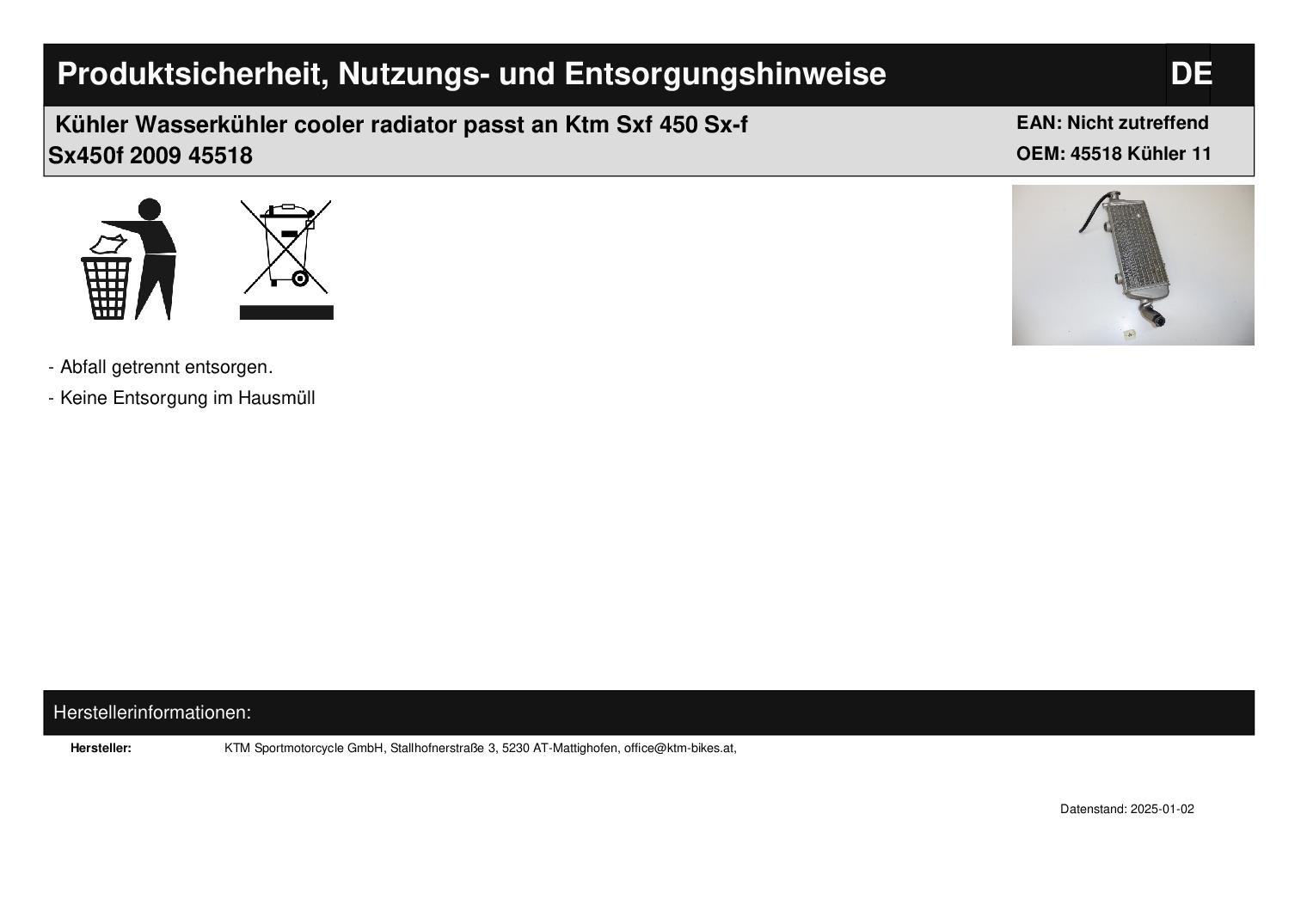 In dieser Auktion gibt es folgenden Artikel zu kaufen: Kühler (siehe Foto) Fahrzeug: passend für KTM SXF 450 (4-Takt) Bj.: 2009 (evtl. auch für andere Modelle; einfach Kühlernummer vergleichen!) Teilenummer: 45518 (seitlich auf dem Kühler eingeprägt) Lieferumfang: siehe Foto Artikelzustand: crosstypische Gebrauchsspuren vorhanden; Kühler ist durch Sturz leicht eingedrückt, jedoch dicht; Zustand siehe Foto Bei Unklarheiten oder Fragen bitte erst E-Mail schreiben.